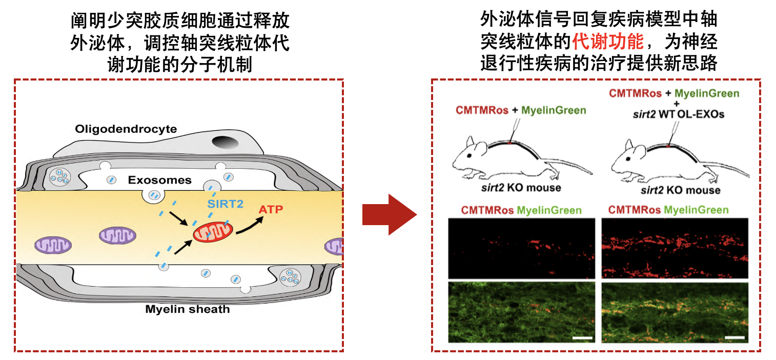 神经退行性疾病是一类由神经元功能和结构丧失所导致的认知障碍的统称,在包括帕金森氏症、阿尔兹海默症在内的神经退行性疾病中均发现了能够造成轴突线粒体功能、运输、质量控制缺陷的基因突变。此外,一些神经退行性疾病中蛋白的异常堆积也会影响到线粒体的完整性和运输能力。这些线粒体的异常将造成轴突末梢能量的慢性亏损,并在神经退行性疾病发病的早期影响突触功能,最终导致突触前末梢、轴突结构退化。少突胶质细胞是中枢神经系统中的一类神经胶质细胞,可形成髓鞘包裹中枢神经系统神经元的轴突,但其在生理、病理状态下调控轴突内能量代谢的机制尚不清楚。近年来研究发现,轴突线粒体功能异常和轴突去髓鞘化是渐冻症、脊索硬化症等神经退行性疾病发病早期的共同特征,暗示着轴突退化、轴突能量失衡与少突胶质细胞功能异常之间存在潜在关联。研究三者之间的联系有助于系统地揭示神经退行性疾病发生发展的分子机制,为临床治疗提供新靶点、新思路。