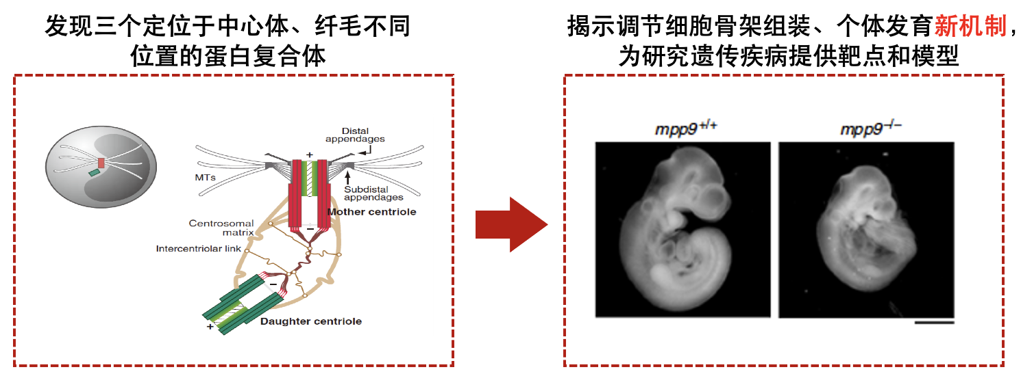 中心体是哺乳动物细胞中重要的微管组织中心,用于保障细胞结构的稳定与有丝分裂的顺利进行。初级纤毛是一种由微管及其附属结构蛋白所组成的不具有运动功能的细胞器,它利用“天线”状的结构,感知和传导在发育和维持稳态过程中不同种类的信号。近年来的研究表明,中心体与纤毛在结构和功能方面的缺陷会导致如脑发育畸形、视网膜退化等遗传性神经系统疾病;与其他细胞器的研究相比,对于中心体、纤毛功能的研究还处于非常初级的阶段。虽然一些可定位于中心体与纤毛的蛋白陆续被发现,但这些蛋白的具体功能,以及保障胚胎正常发育的分子机制尚不清楚。