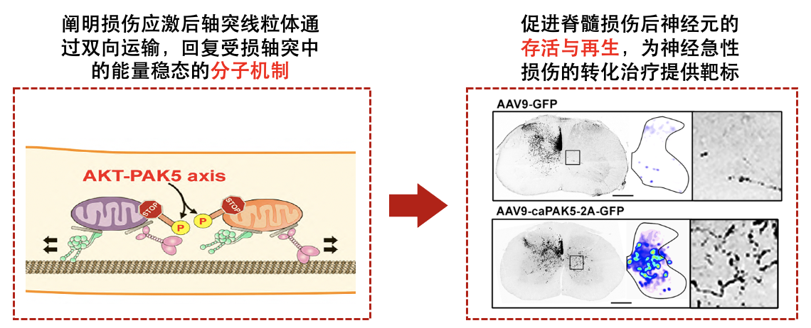 1)利用微流装置在体外分别建立了模拟脑缺血以及轴突损伤的应激模型。结合翻译组学测序分析与嘌呤霉素-邻位连接技术(Puro-PLA)后发现,轴突受到两种不同的应激后,神经元特异性激酶PAK5在轴浆中的蛋白合成明显增加;2)使用荧光探针GO-ATeam2对轴浆中的ATP水平进行实时检测,发现激活AKT-PAK5信号通路能够显著恢复损伤轴浆内的能量稳态;3)在成熟的中枢神经系统神经元、DRG神经元以及离体的成熟小鼠坐骨神经束等三个不同的系统中激活AKT-PAK5信号,轴突线粒体的双向运输明显增加;4)在体外两种不同的损伤模型中激活AKT-PAK5通路,促进健康的线粒体被运送至受损部位,保障受损神经元轴突的存活与再生;5)通过注射腺病毒激活PAK5通路,发现该通路可以促进小鼠脊髓损伤后轴突再生。Curr Biol. (2021, 31(14): 3098-3114,同刊发表评述文章进行报道)(图1)
