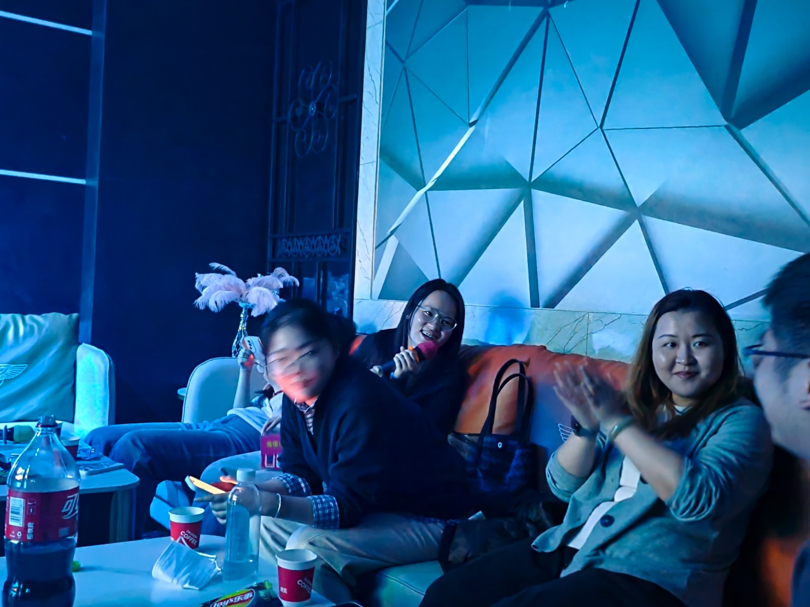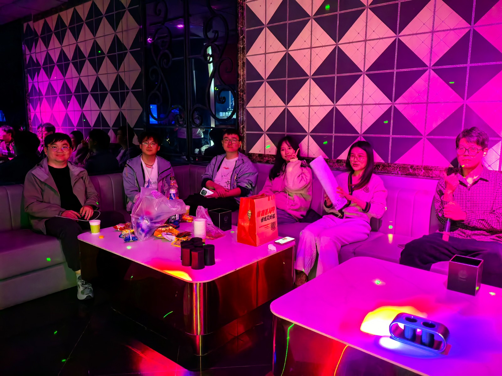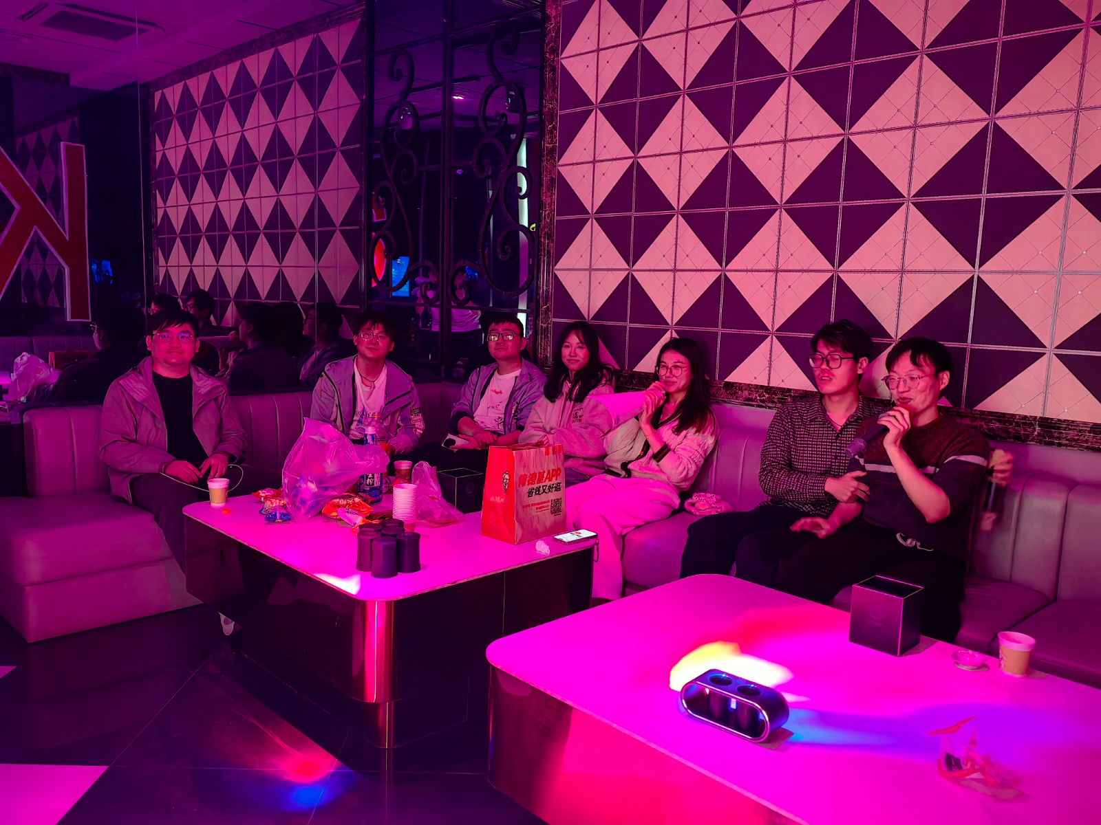 本次活动一共分为三组,分别在三个包厢中进行自由K歌,尹伊霄和周青钰同学一首麦恩莉致敬音乐才子方大同,悠扬动听的歌声,温暖柔和的灯光,大家的心灵仿佛在此刻产生共鸣;不多时,《我的好兄弟》旋律响起,张成卓中气十足的歌声彻底点燃现场气氛,在场的师兄弟不自觉打起了节拍,加入了合唱,师门一起奋斗的情谊皆在不言之中。一声“娘子”将众人思绪拉回,《郎的诱惑》节奏响起,充满搞怪趣味的歌声引得哄堂大笑,在欢乐之中将现场的氛围推向了最高潮。
