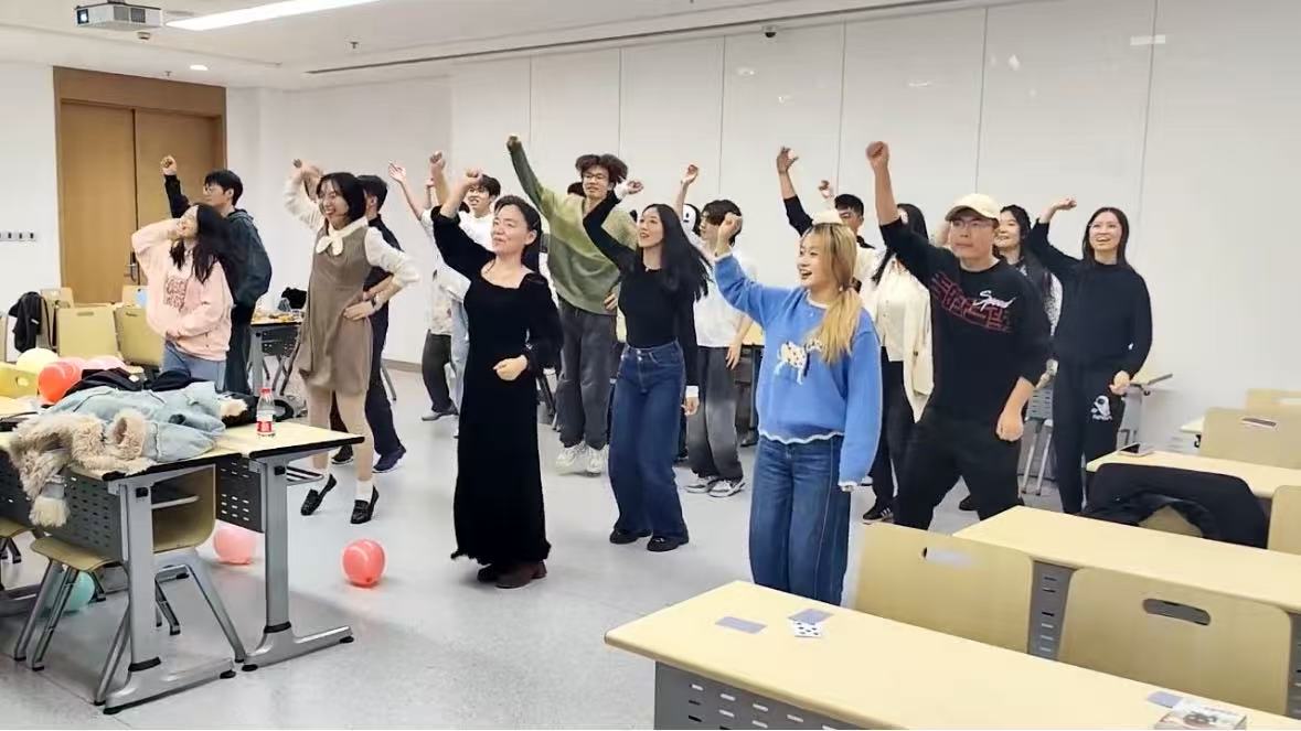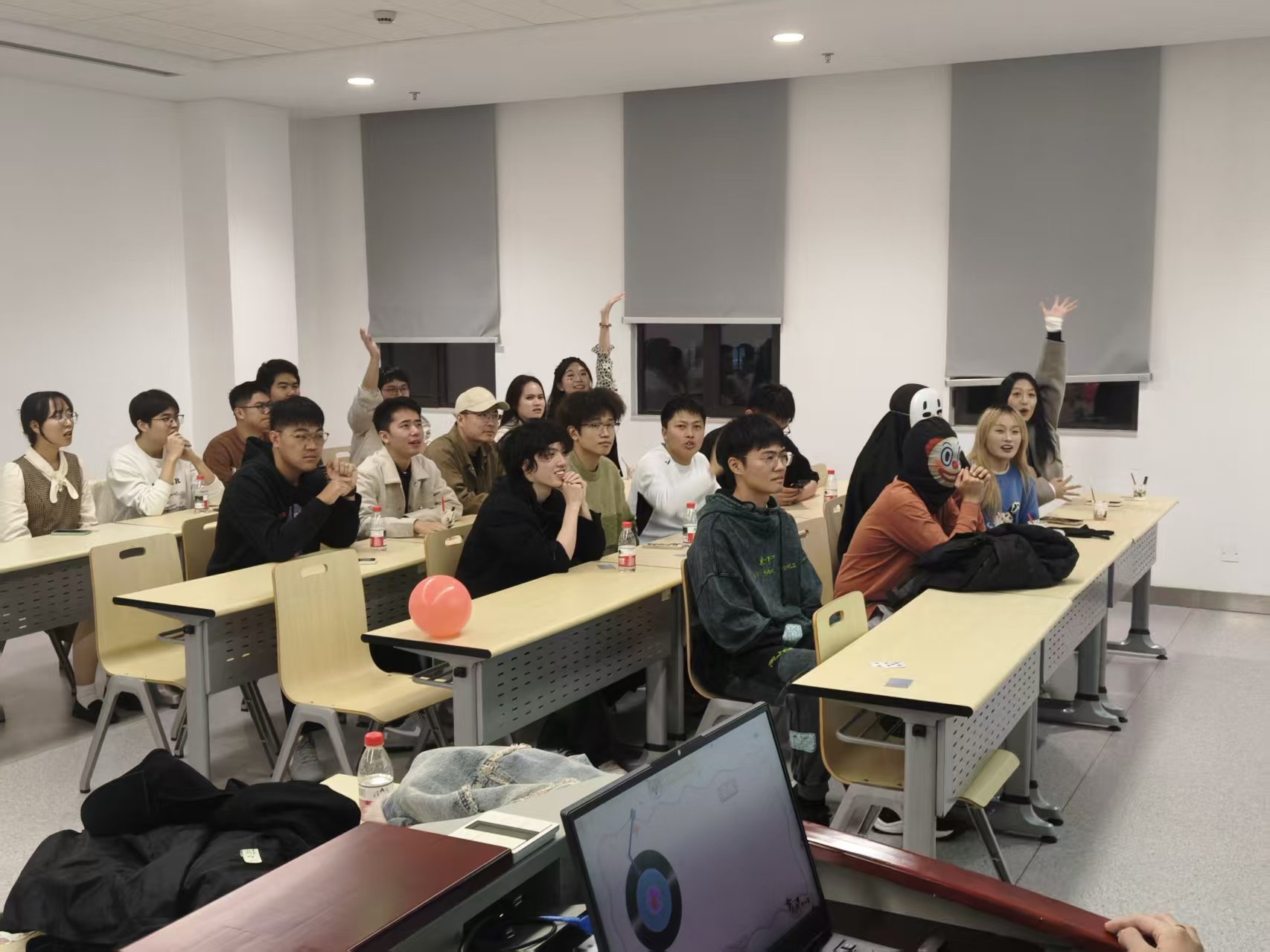 五轮游戏结束,积分定格,掌声响起。两组获胜成员一起上台拍照,留下珍贵的纪念影像,同学们也拉起横幅,一起定格下最美的瞬间。至此,万圣节狂欢夜之旅圆满收官。活动虽暂时结束,但情谊之花常开——愿今日笑声化作未来同行灯火,照亮我们团队奋进的长路。(撰写人:朱麟宏)