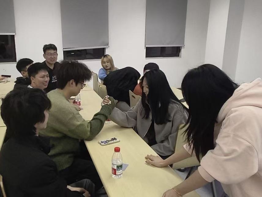 游戏开始前,同学们随机抽取自己的号码牌,而抽到“国王”牌的同学可随机指定某个号码进行某种“大冒险”惩罚。说完规则后同学们就已跃跃欲试。游戏一开始,空气里已充满损友的味道,“3号和7号申请对视十秒并互说土味情话表白”、“11号和19号掰个手腕,输的人大冒险”、“2号和5号上台合唱熊出没主题曲”、“16号上台跳一段奶龙舞”……国王一声令下,大冒险也随之开始,剩下同学的笑声也是接连不断、此起彼伏。