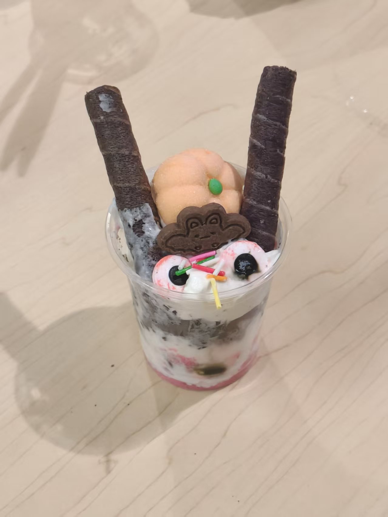 在这一环节中,大家利用准备好的奶油罐、奥利奥碎、万圣节糖果等材料制作属于自己的木糠杯甜品。同学们把奶油罐摇成半瓶“雪花”,一按喷嘴,一条奶油花直接趴在杯底;接着抓把奥利奥碎,像撒土一样盖上去,黑白相间,看着就香。再挤一层奶油,再撒糖,万圣节的小骷髅糖、南瓜糖随心放置,十分钟不到,一排木糠杯站好,外形迥异却都不失特色。