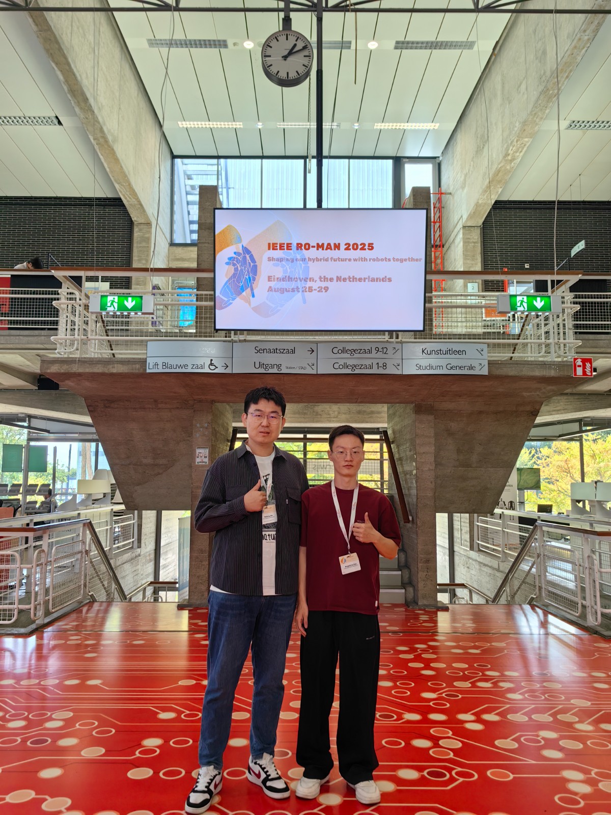 2025年8月,本团队派出博士研究生鲍丙生与马培锋前往荷兰埃因霍温,参加了由IEEE RAS协会主办,荷兰埃因霍温理工大学承办的第34届 IEEE 机器人与人机交互通信国际会议(IEEE RO-MAN 2025)。
