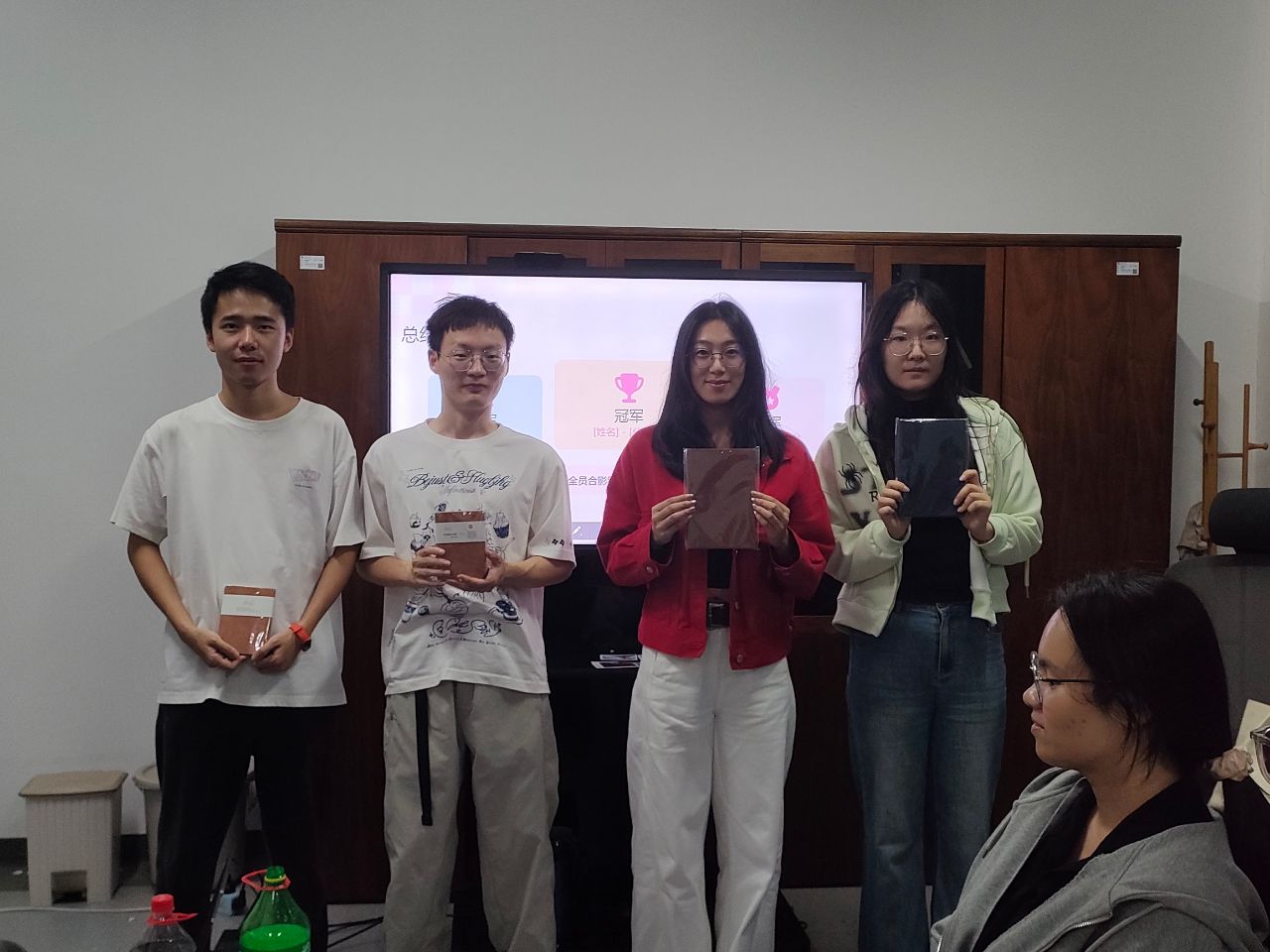 五轮游戏结束,积分定格,掌声响起,四位“高分王者”登台领奖合影。活动结束之际,我杯相碰,共祝“科研顺利、友谊长存”。至此,破冰之旅圆满收官,麦克风暂闭,情谊之花常开——愿今日笑声化作未来同行灯火,照亮我们团队奋进的长路。(撰写人:高鑫琪)