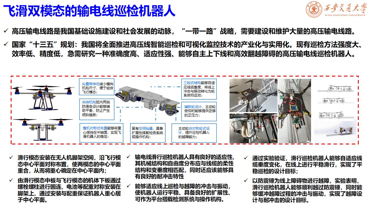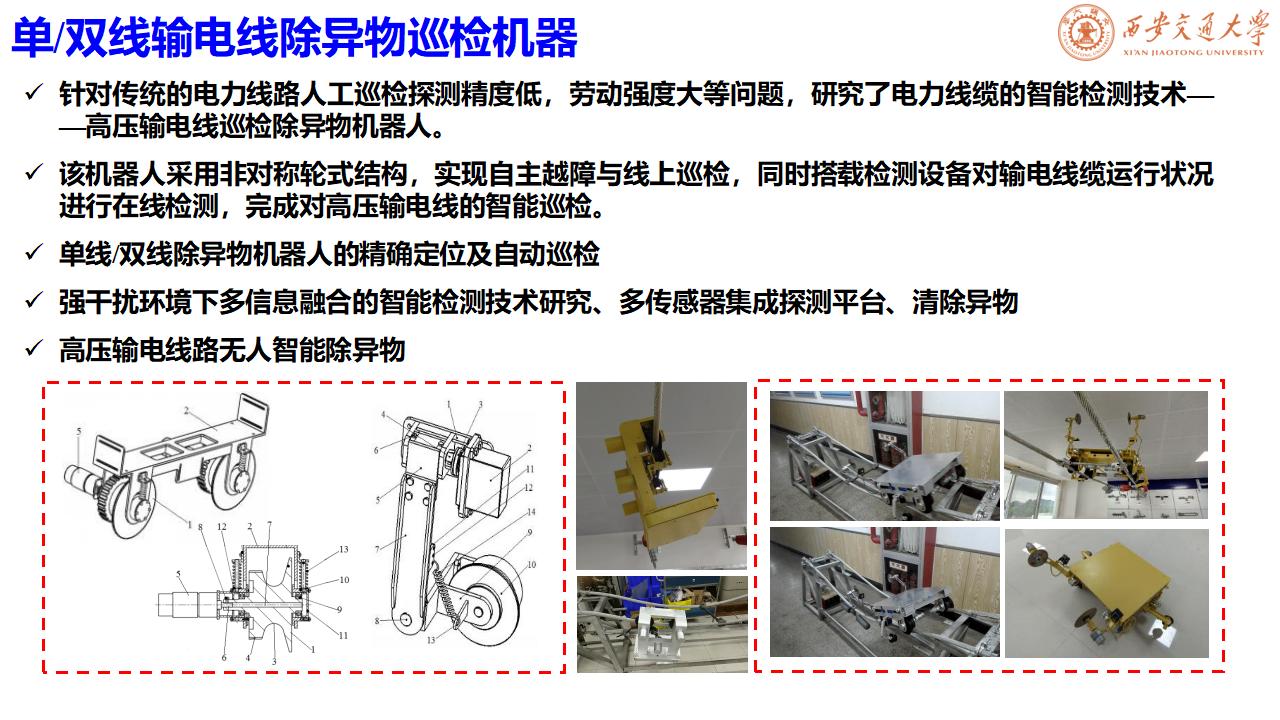 高压输电线巡检机器人是一种通过爬越机构在高压输电线上爬行移动以及爬行越障的机器人,并能通过在机器人上搭载的传感器来近距离检测输电线上的缺陷,这种巡检机器人可以近距离的检测输电线,使巡检结果更加准确。爬滑复合巡检机器人是一种既能通过驱动滚轮在输电线上滑行运动,也能通过爬行机构在输电线上爬行越障的机器人。