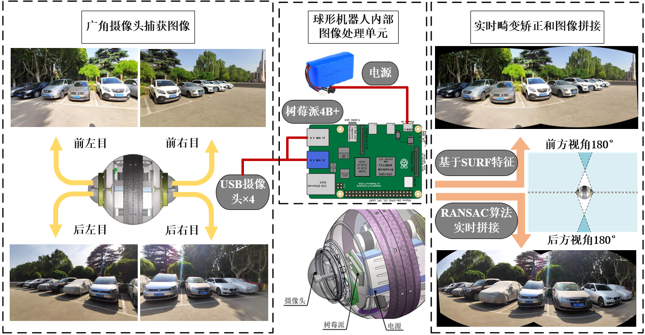 | 核心技术:基于SURF特征的图像拼接技术、基于单应矩阵的双目视觉图像投影和拼接技术、基于机器学习的实时目标检测技术 突出亮点:机器人360°全景感知与目标识别 应用前景:具备全景感知和目标识别功能的球形机器人、六足机器人 |