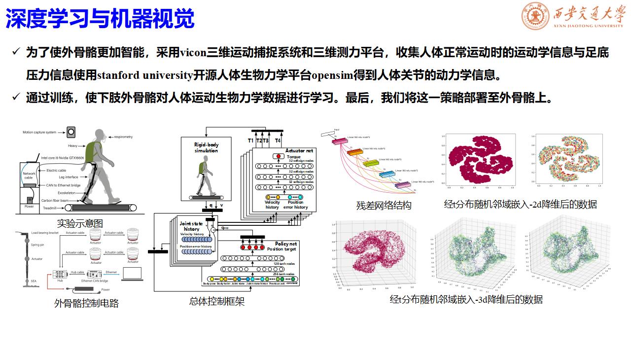 | 核心技术:多模态深度学习的步态识别及追踪技术通过基于卷积神经网络的深度学习模型,对传统物理传感器和生物信号(脑电、肌电)等多模态传感器信息进行空间维度和时间维度的耦合特征提取,建立以人、外骨骼机器人相互协同的智能系统,实现从多模态传感训练信息到人体步态准确分类、追踪等运动意图分析的端到端输出。 突出亮点:机器视觉辅助的多模融合控制技术将机器视觉技术与传统的多模态信息分析技术相融合,通过深度摄像机等视觉信息采集设备充分挖掘周围环境对运动决策的内在影响,在人机交互智能系统的基础上引入视觉环境辅助,将人的智能判断与多模信息、视觉辅助的机器自主决策相融合,提升外骨骼机器人在因应不同环境时对人的判断决策进行辅助矫正的能力,实现外骨骼机器人全局、准确、高鲁棒性、高速、实时的人-机-环境融合控制。 |