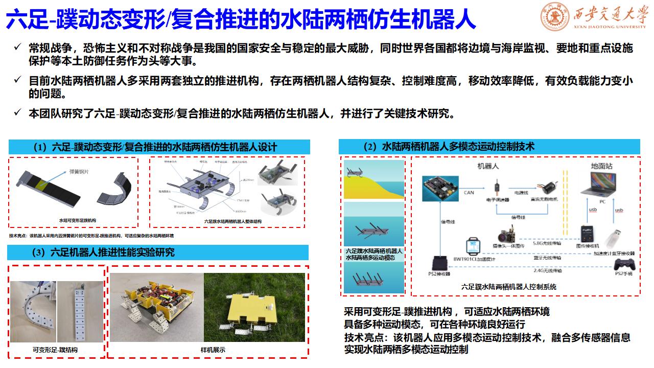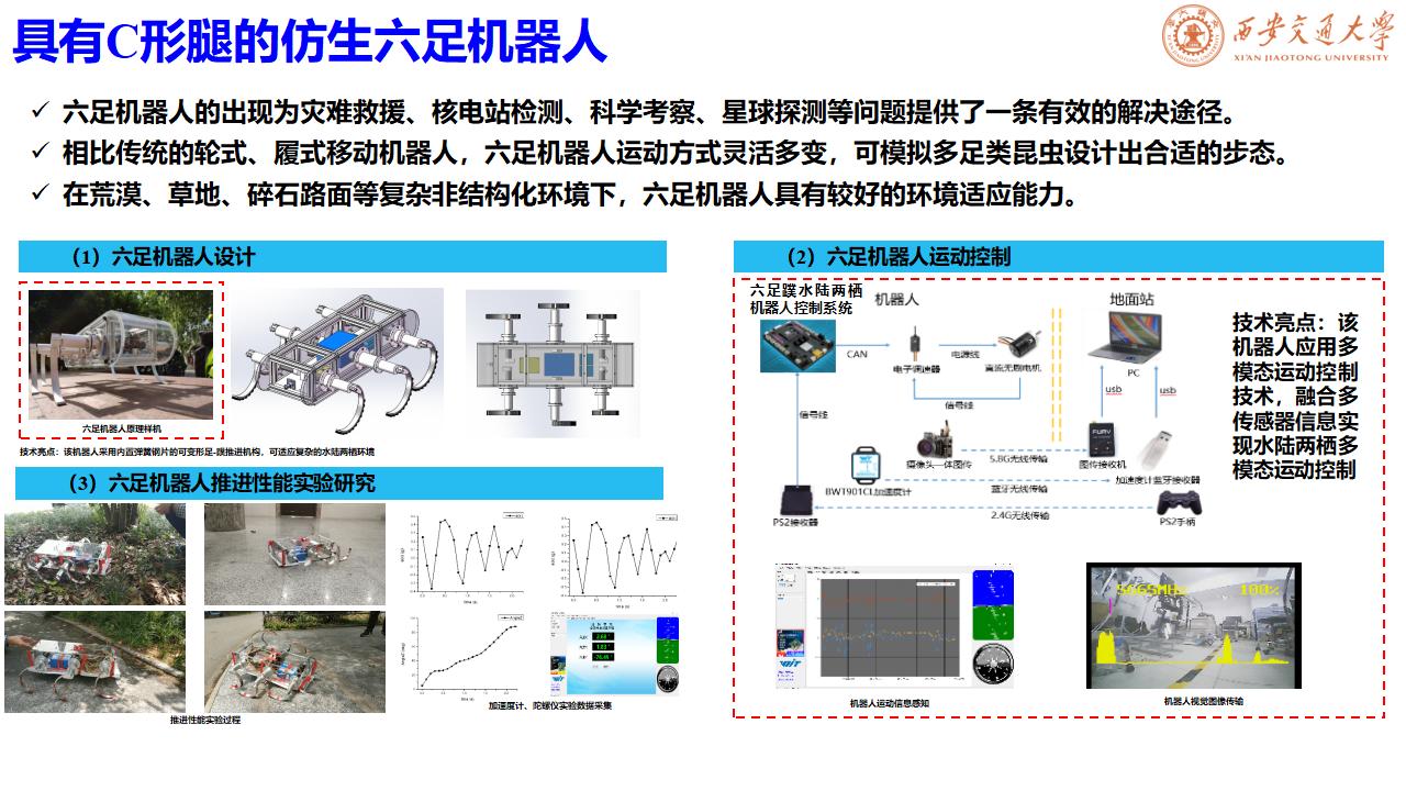 | 仿生六足机器人是仿生移动机器人的典型代表,具有丰富的步态和冗余的肢体结构,凭借其离散式的地面支撑和对障碍、沟渠等复杂特殊地形及不可预知环境的极强适应性,具有广泛的应用前景。仿生六足机器人主要针对“六足纲”昆虫(蟑螂、蚂蚁等等)实现仿生机器人。仿生六足机器人涉及机器人学、仿生学等多学科技术,是一个多学科高度交叉的复杂系统, 要使其具备足式生物卓越的地形适应能力与灵活完成复杂仿生运动的潜能,需要突破多方面瓶颈技术的限制,解决仿生结构设计、步态规划、多足协调控制等系列技术难题,以提高六足机器人整体运动性能。 | |