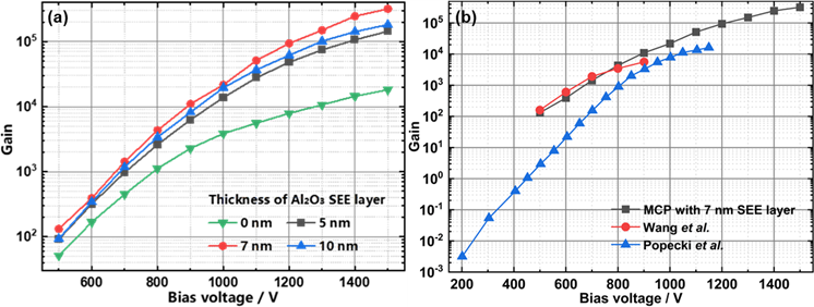 不同二次电子发射功能层厚度的微通道板器件增益性能对比