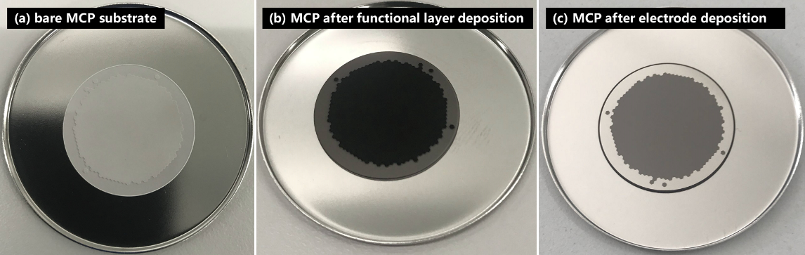 未沉积或已沉积功能层的微通道板器件的物理照片(a)无任何功能层的裸微通道板基底(b)沉积导电层和二次电子发射功能层后的微通道板器件