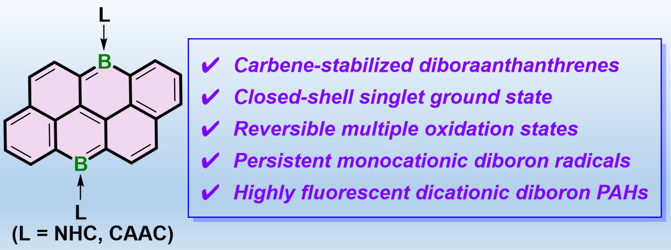 21. Jiawei Fan, Ling Yue, Ce Liu, Bin Rao, Guijiang Zhou, Anyang Li,* Bochao Su,* Isolation of Fluorescent 2π-Aromatic 1,3-Disiladiboretenes, J. Am. Chem. Soc. 2024, 146, 39.