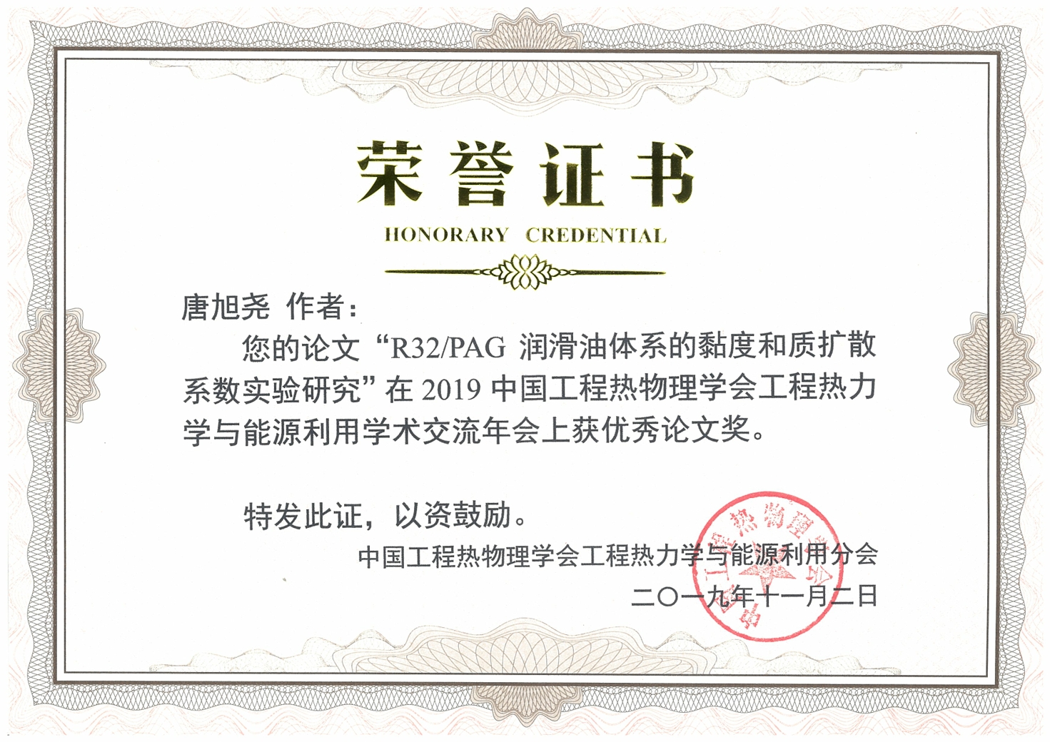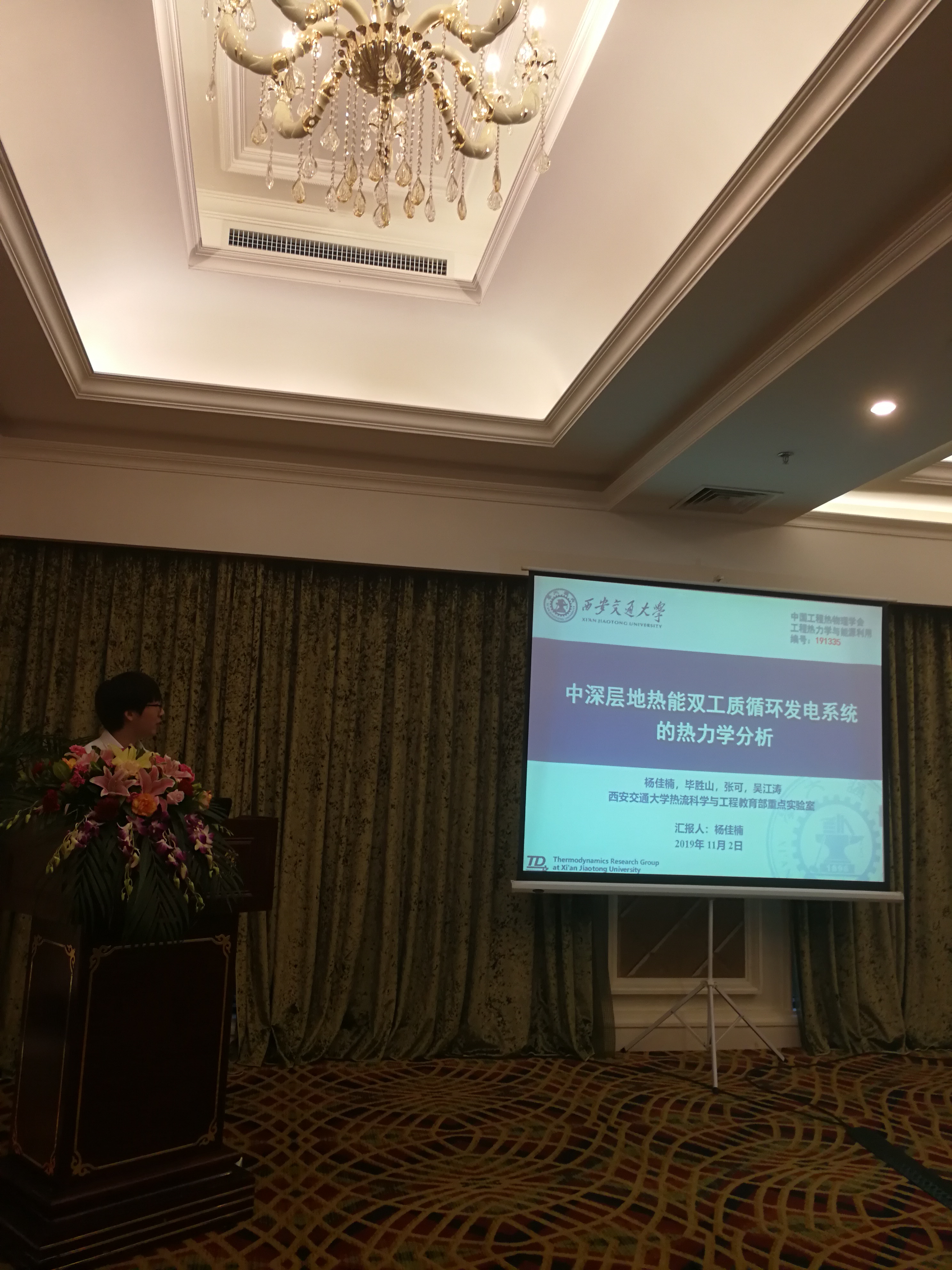 2019年11月1日至4日,2019年中国工程热物理学会工程热力学与能源利用学术会议在桂林召开,课题组10余人参加了此次会议,研究生符文、唐旭尧、杨佳楠进行了口头报告,崔军卫和王阳进行了墙报展示。唐旭尧获得了优秀论文奖。