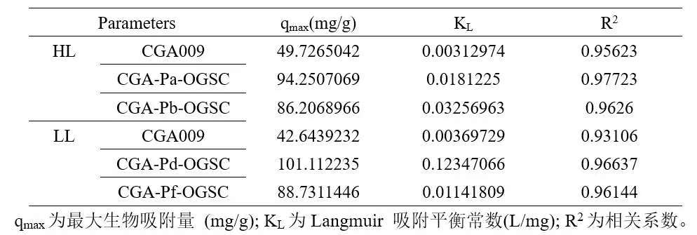 另外,细菌在添加了1mM Cd2+的培养基中生长至稳定期后,高光强下CGA009的上清液中残留了56.8 mg/L Cd2+,吸附率只有46.5%,而CGA-Pa-OGSC和CGA-Pb-OGSC的上清液残留量分别为9.9 mg/L和8.1 mg/L,吸附率达到了90.7%和92.4%。低光强下,CGA009的上清液残留了46.4 mg/L Cd2+,而CGA-Pd-OGSC的上清液残留量仅为4.7 mg/L,吸附率达到了95.6%。此外,采用Langmuir等温模型对吸附数据进行拟合,拟合效果较好。高光强下CGA-Pa-OGSC和CGA-Pb-OGSC的最大生物吸附量分别为94.25和86.21 mg/g,约为野生型的1.9倍和1.7倍。低光强下,CGA-Pd-OGSC和CGA-Pf-OGSC的吸附能力均为野生型的2倍以上。本研究构建的表面展示系统能够适用于高浓度Cd2+的环境,具有较高的Cd2+去除率。