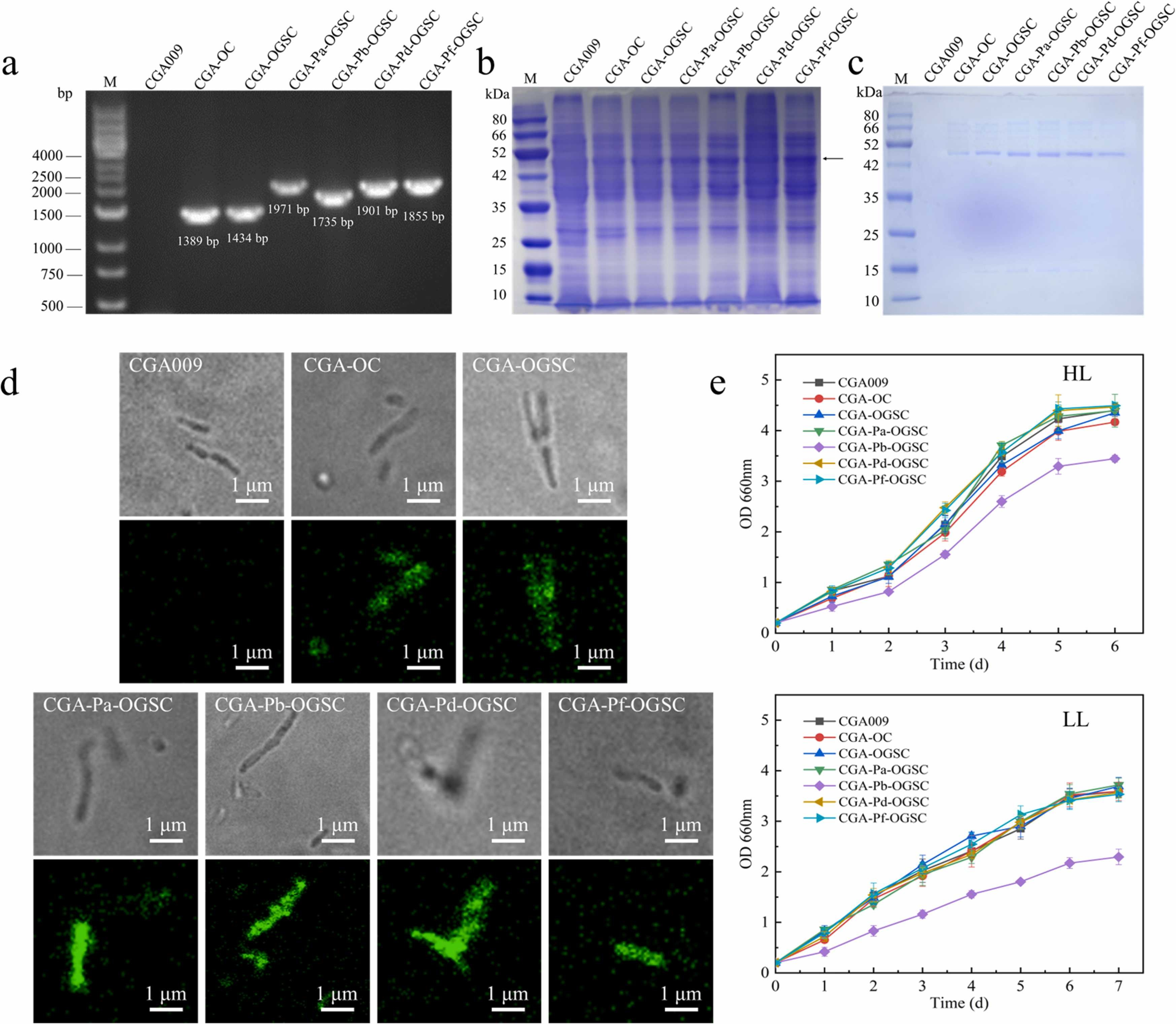 图2. 鉴定表面展示系统的构建并验证其稳定性。a, 野生菌和6株工程菌菌液PCR产物的琼脂糖凝胶电泳图像;b, 野生菌和6株工程菌培养4d后提取的总蛋白样品进行10% SDS-PAGE分析的结果。蛋白条带通过考马斯亮蓝染色显示。目标蛋白大小为45-48kD;c, 使用His-tag Protein Purification Kit(Beyotime)纯化处理后的目标蛋白再次进行10% SDS-PAGE分析的结果;d, 免疫荧光图像确定融合蛋白在细胞表面表达。AlexaFluor488荧光素标记的His标签抗体检测融合蛋白N端的6*His标签,并显示其表达位置;e, 野生菌和6株工程菌在高光强和低光强下的生长曲线。