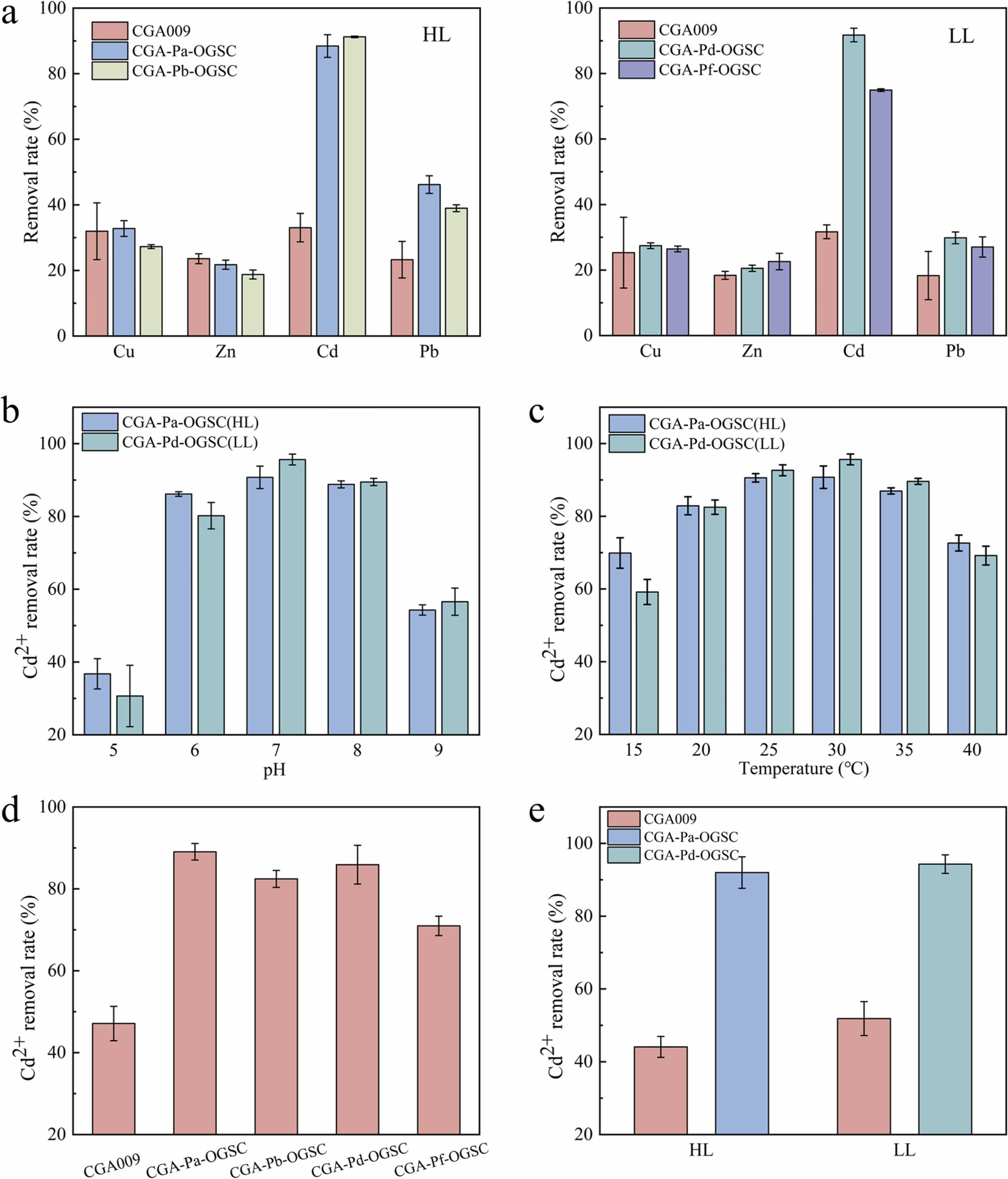 图5. 表面展示系统的生物吸附选择性和稳定性分析。a, 高光强(左)和低光强(右)下野生菌和工程菌对不同二价金属离子的吸附率。CGA-Pa-OGSC(HL)和CGA-Pd-OGSC(LL)在pH 5~9(b)、15~40℃(c)的Cd2+吸附率。d, 野生菌和工程菌在中光强(ML, 3000 lux)下的Cd2+吸附率。e, 高光强和低光强下野生菌和工程菌在Cd废水中的生物吸附率。