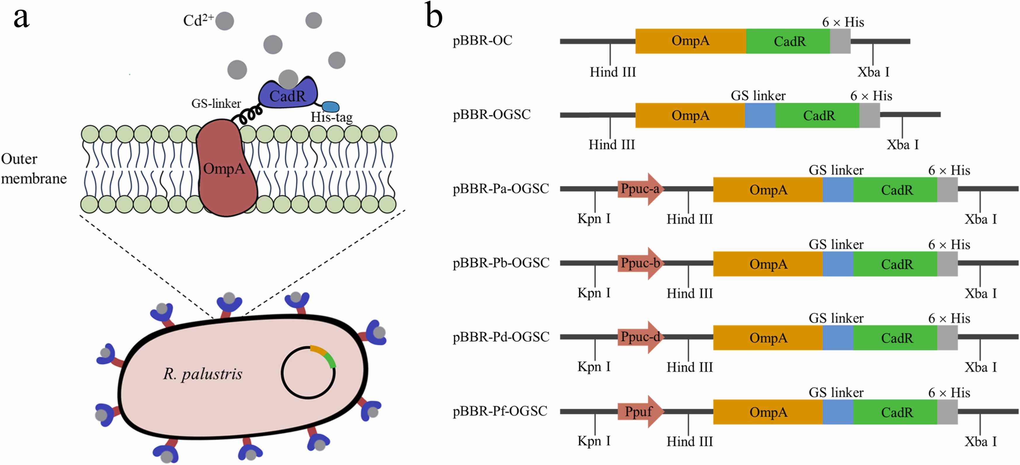图1. CadR表面展示系统用于Cd2+生物修复。a,CadR蛋白在沼泽红假单胞菌表面展示的示意图;b,重组质粒结构示意图。