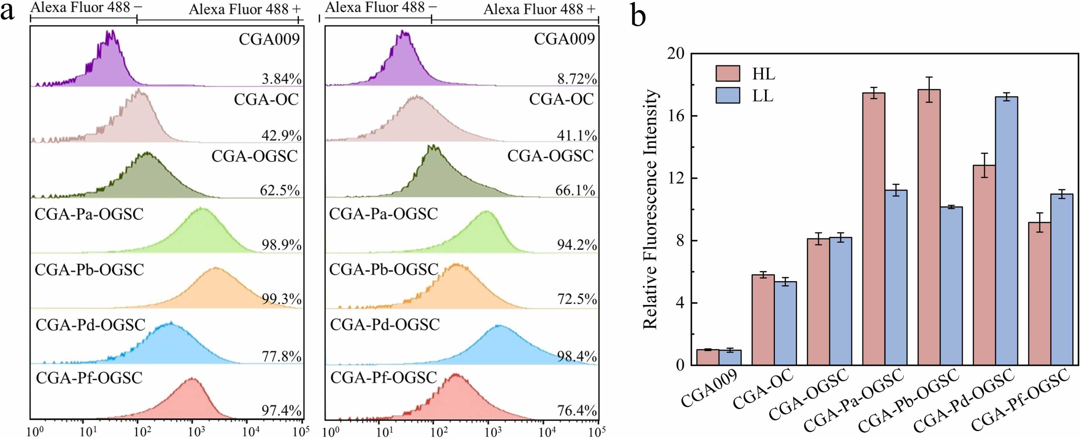 图3. 不同光强下连接肽和启动子对表面展示效率的影响。a, 高光强(左)和低光强(右)下野生菌和6株工程菌的流式细胞分析结果。野生型CGA009为阴性对照。结果以直方图模式展示,并标明了阳性细胞计数。b, 不同光强下野生菌和工程菌的相对荧光强度。其中以高光强下200 μL的CGA009培养物(OD660为0.4)对应的荧光强度数值为一个单位。