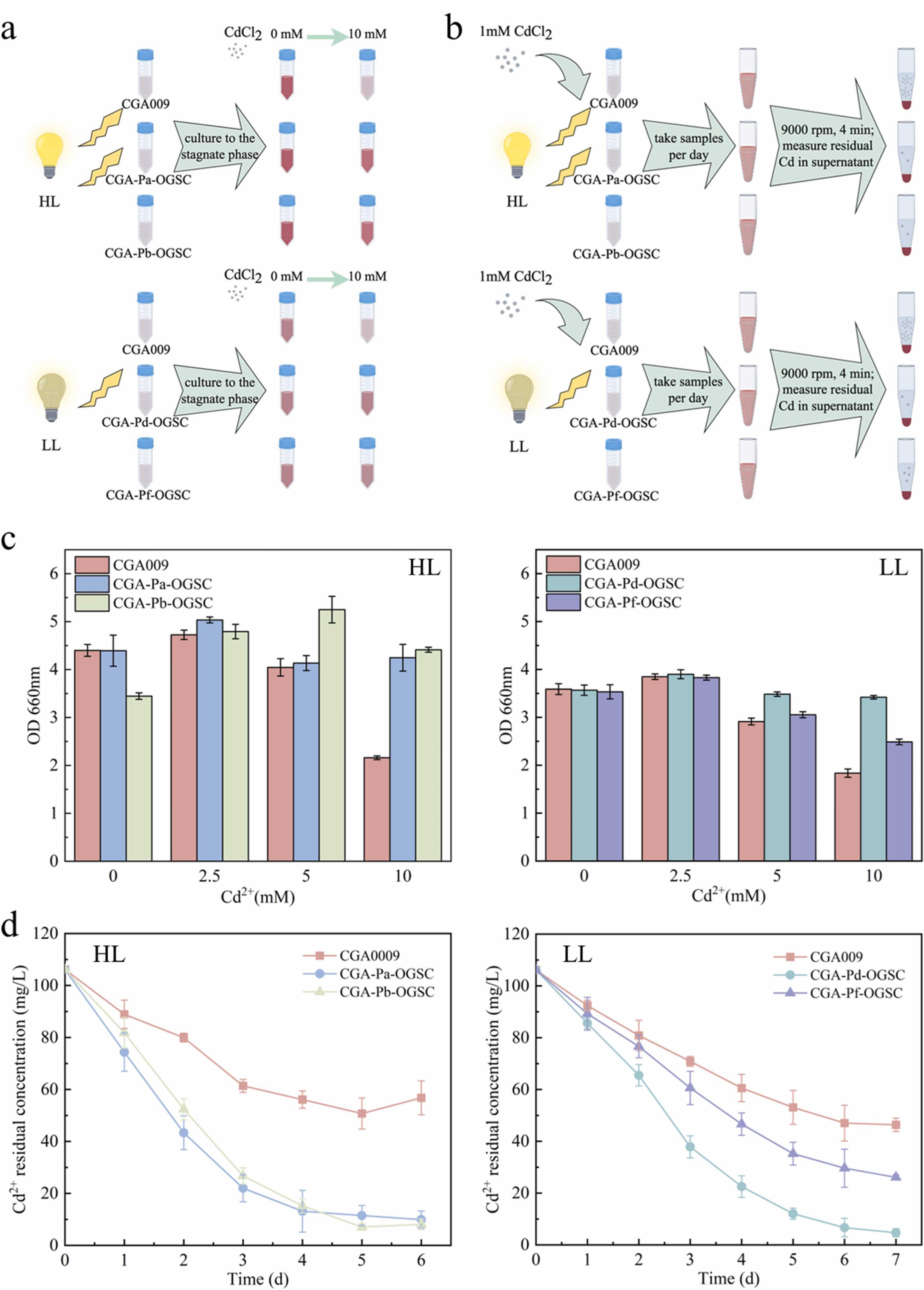 图4. 表面展示系统在重金属生物修复中的应用。探索镉耐受性(a)和吸附率(b)的实验流程示意图。c,野生型和工程菌在不同Cd2+浓度下高光强和低光强条件下的最大生长密度。d,高光和低光条件下野生型和工程菌培养基上清液中Cd2+的残留浓度。