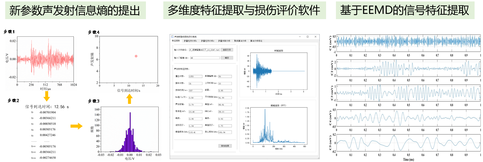 (1)发展了复杂环境下声发射信号多维特征提取技术:基于信息熵理论提出了一种新的声发射特征参量——声发射信息熵;从时域、频域和时频域等多维度提取关键特征,发展完善了声发射多维度特征提取方法,设计开发了声发射多维特征提取软件。