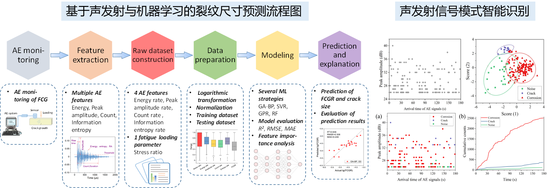 (3)发展了基于人工智能与声发射特征相融合的故障诊断技术:建立了基于机器学习的声发射信号模式识别与故障智能诊断技术,为材料损伤与机械故障的早期准确诊断奠定基础。