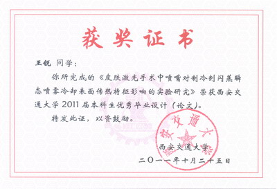 - 王锐同学荣获西安交通大学2011届本科生优秀毕业设计(论文)