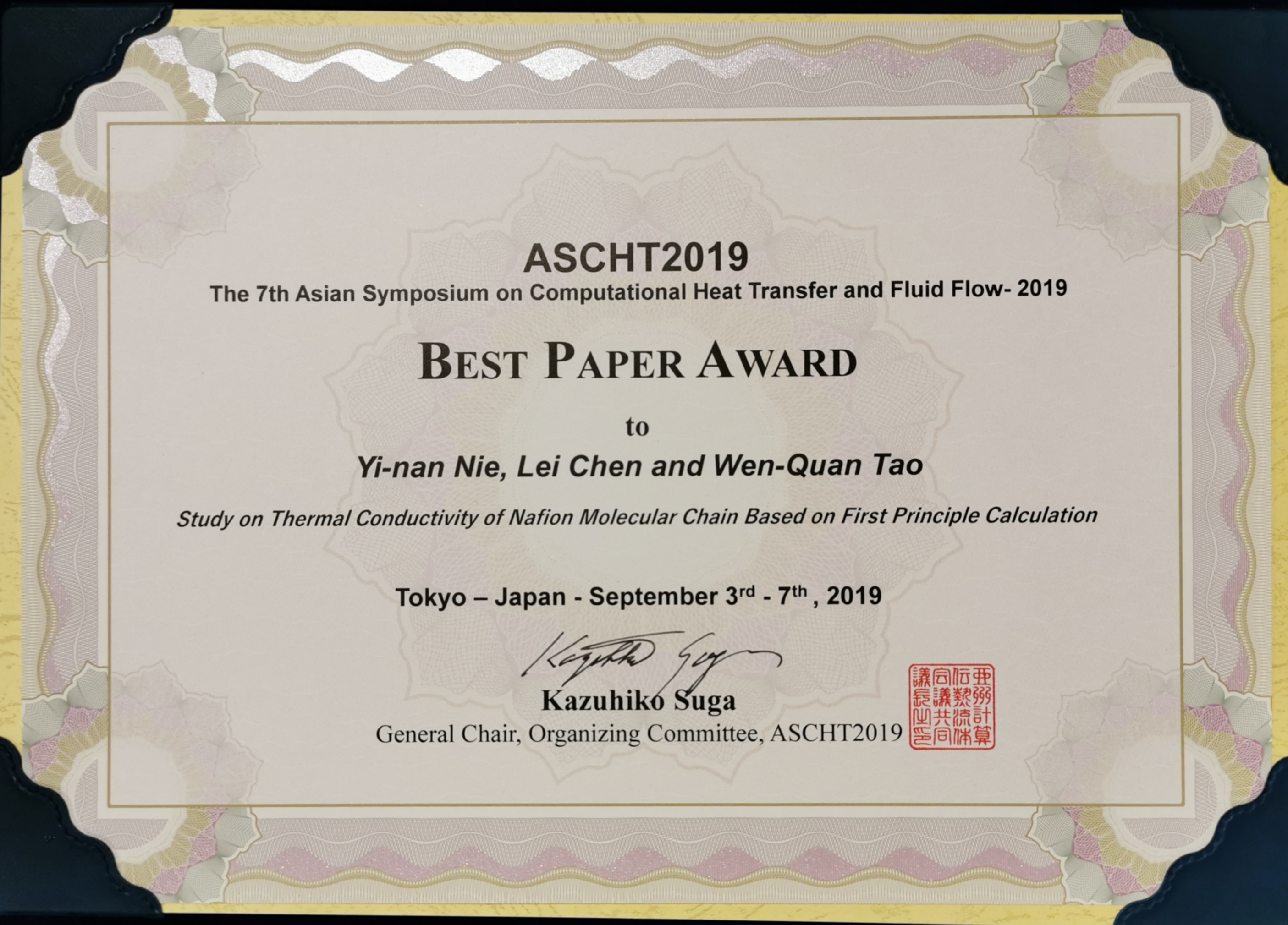 - 2019年9月3日至9月7日,第七届亚洲计算传热与计算 流体会议(ASCHT-2019)在日本东京科技大学召开。来自中国、日本、韩国、英国等国家的200余位学者和代表参加了会议。 大会分9个分会场,16个分领域,设2个特邀报告,10个大会报告,216个分会场报告。 热烈祝贺本人指导的硕士研究生聂祎楠同学获得最佳论文奖。