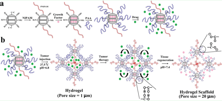 Abstract: To achieve effective tumor therapy and regenerate new tissue from defects formed by tumor atrophy, a dual responsive hydrogel integrating the stepwise delivery of anti-tumor drugs/growth factors and pH/thermo induced structural transformation is developed, based on polymer (poly N-isopropylacrylamide (PNIPAM) and polyacrylic acid (PAA)) functionalized mesoporous silica nanoparticles (MSNs). Due to the thermally responsive tangle between PNIPAM chains and the pH triggered hydrogen bonds in PAA chains, these injectable MSNs would immediately switch from nanoparticles to compact hydrogels in a tumor environment (37.5 degrees C, pH 6.8), where the concentrated network structure in the hydrogel is in charge of the loading and local delivery of anti-tumor drugs. The MSNs serve as nanocarriers for growth factors, which are localized by crosslinked networks. The sustained release of growth factors only occurred with the cleavage of hydrogen bonds in PAA chains, which is triggered by the pH increase to 7.4 after the cure of the tumor. Moreover, the hydrogen bond cleavage would also cause the swelling of the hydrogel, which not only fills the defects but generates plenty of cell-level pores, resulting in an excellent scaffold for attachment and proliferation of healthy cells. Therefore, the dual responsive MSN-hydrogels offer a promising strategy for sequential tumor therapy and tissue regeneration