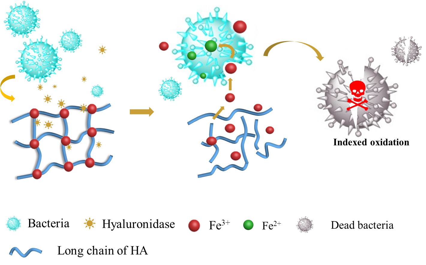 Abstract: Microbial infection has been considered as one of the most critical challenges in bioengineering applications especially in tissue regeneration, which engenders severe threat to public health. Herein, a hydrogel performing properties of rapid self-healing, on-demand antibiosis and controlled cargo release was fabricated by a simple assembly of Fe complex as the cross-linker and hyaluronic acid as the gel network. This hydrogel is able to locally degrade and release Fe3+ to kill bacteria as needed because of hyaluronidase excreted by surrounding bacteria, resulting in efficient antibacterial activity against different types of bacteria. The sustained release property of certain types of growth factors was also observed from this hydrogel owing to its dense network. Moreover, this hydrogel could repeatedly heal itself in minutes because of the coordination interaction between Fe3+ and COOH, exhibiting good potential in bioengineering applications on the exposed tissue, where the materials are easily damaged during daily life. When topically applied onto damaged mouse skin with infection of Staphylococcus aureus, the hydrogel is able to inhibit microbial infections, meanwhile promoting cutaneous regeneration, which formed new skin with no inflammation within a 10 day treatment. These results demonstrate the potential application of this self-healing hydrogel for the integrated therapy of antibiosis and tissue regeneration.