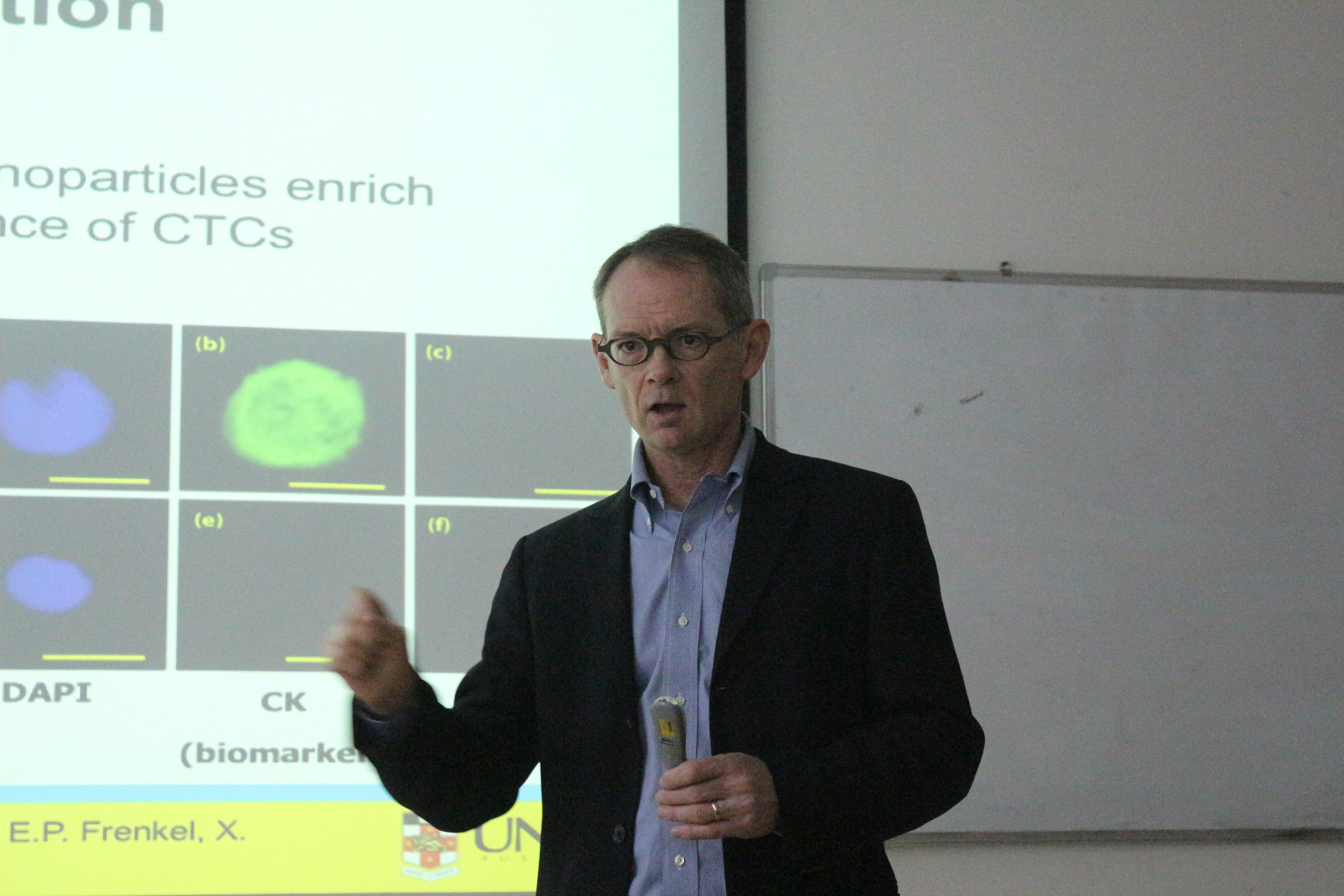 首先是Justin Gooding 教授做报告。Justin Gooding 教授毕业于牛津大学及剑桥大学,曾任国际电化学学会副主席,澳大利亚皇家电化学学会主席。目前为澳大利亚研究委员会桂冠学者,同时任澳大利亚纳米医学中心联合主任及美国化学会旗下国际学术期刊ACS Sensor的主编。Justin Gooding 教授主要致力于纳米生物传感器、生物医用材料、功能性电化学材料的研究,在Nature Immunology, Nature Nanotechnology, Nature Communications, AM, JACS等国际顶级学术期刊发表论文400余篇。