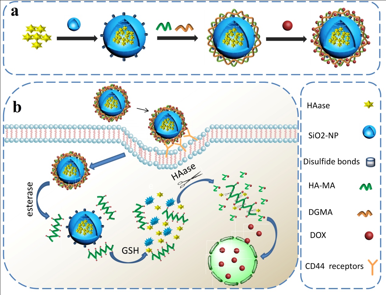 Abstract: Tumors have characteristic physiochemical conditions different from normal tissue, which makes therapy combining chemotherapeutic drugs and tumor microenvironment-responsive nanocarriers a promising route for cancer treatment. Here, we introduce a concept of integrating catalytic nanomedicine and selective chemotherapy for accurate therapy of early stage tumors by co-delivery of enzymes and prodrugs into tumor sites through a multi-responsive nanoplatform. The nanoplatform consists of a polyester–hyaluronic acid–doxorubicin (PE–HA1000k–DOX) prodrug as the corona, physiologically biodegradable silica containing disulfide bonds as the shell and hyaluronidase (absent in early stage tumors) as the core. This nanoplatform is able to quickly enter tumor cells through CD44-HA affinity. Then, the esterase and glutathione rich in tumor cells would respectively degrade the polyester and silica to release HA–DOX and hyaluronidase in a stepwise manner. Finally, highly toxic dissociative DOX is produced through decomposition of the resulting HA–DOX, catalyzed by hyaluronidase, for the apoptosis and death of the tumor cells. The properties of tumor-targeting uptake, tumor microenvironment responsiveness, efficient co-delivery of the enzyme and prodrug, and intracellular enzymatic reaction induced cytotoxicity resulted in a four-fold efficacy against tumor cells over normal cells, indicating that our nanoplatform is a promising material able to achieve both selectivity and efficiency concurrently for tumor therapeutics.