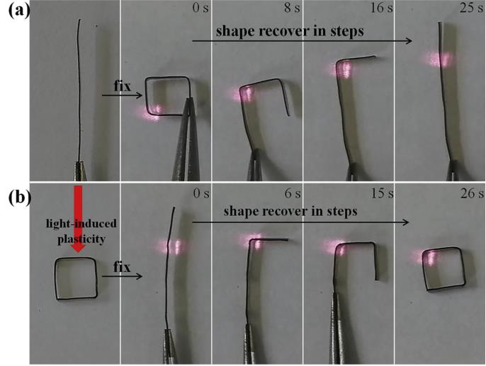 Abstract: A NIR light-induced shape memory composite with light-induced plasticity was prepared by incorporating graphene oxide (GO) into cross-linked poly (vinyl butyral) (PVB). The cross-linked reaction between PVB and aromatic diisocyanate not only endowed the composites with excellent shape memory properties, but also offered the performance of solid-state plasticity due to the formation of carbamate bonds. The photo-responsive performance was introduced to the system by doping GO, a conventional photothermal reagent, resulting in excellent NIR light-induced shape memory properties and light-induced plasticity. According to the stress relaxation tests, the solid-state plasticity of composites could be regulated by the cross-linked density, GO, catalyst dosage and temperature. Moreover, the composites can be repeatedly programmed to a new permanent shape via a light-induced plasticity process, which still exhibited excellent light-induced shape memory properties even after 5 cycles of reconfiguration. The results demonstrate the promising prospect of these composites as actuator elements for applications in self-deployment devices and soft robotic.