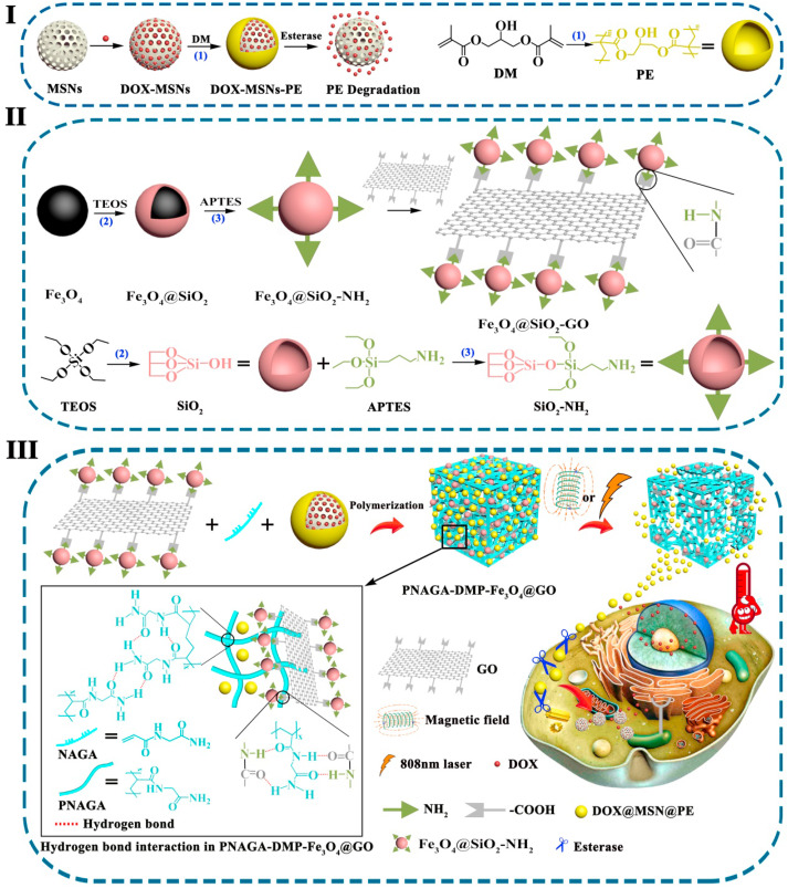 Abstract: Chemotherapy is one of the most commonly utilized approaches to treat malignant tumor. However, the well-controlled chemotherapy able to accurately manipulate local drugs for on-demand tumor treatment is still a challenge. Herein, a magnet and light dual-responsive hydrogel combining thermosensitive poly(N-acryloyl glycinamide) (PNAGA), doxorubicin (DOX) loaded and polyester (PE) capped mesoporous silica nanocarriers (MSNs) as well as Fe3O4 nanoparticles (Fe3O4 NPs) grafted graphene oxide (GO) was fabricated to address above issue. The Fe3O4 NPs and GO respectively serve as magnetothermal agent and photothermal agent to perform hyperthermia, meanwhile to generate chain motion of PNAGA with varying degrees under different conditions of magnetic field and/or NIR irradiation. This strategy not only allowed the gel-sol transition of the hydrogel by prior heating for tumor injection, but performed controllable release routes of DOX-MSNs-PE (DMP for short) nanocarriers to meet various requirements from different patients and the changing states of tumor. Furthermore, these escaped DMP nanocarriers could be taken by surrounding tumor cells, and then deliver their drug to these cells after rapid hydrolysis of the PE cap triggered by esterase, resulting in accurate chemotherapy. Both in vitro and in vivo results indicated that the PNAGA-DMP-Fe3O4@GO hydrogel combining well-controllable chemotherapy and hyperthermia can eliminate more than 90% tumor cells and effectively inhibit the tumor growth in mice model, demonstrating the great candidate of our hydrogel for accurate tumor therapy.