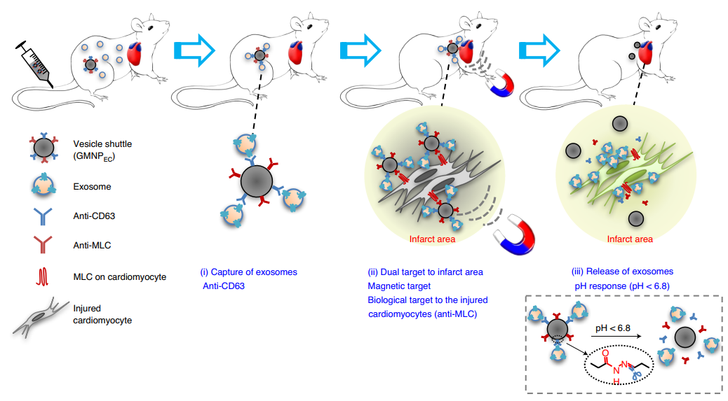 Abstract: The systemic biodistribution of endogenous extracellular vesicles is central to the maintenance of tissue homeostasis. Here, we show that angiogenesis and heart function in infarcted heart tissue can be ameliorated by the local accumulation of exosomes collected from circulation using magnetic nanoparticles. The nanoparticles consist of a Fe3O4 core and a silica shell that is decorated with poly (ethylene glycol) conjugated through hydrazone bonds to two types of antibody, which bind either to CD63 antigens on the surface of extracellular vesicles or to myosin-light-chain surface markers on injured cardiomyocytes. On application of a local magnetic field, accumulation of the nanoparticles and cleavage of the hydrazone bonds under the acidic pH of injured cardiac tissue lead to the local release of the captured exosomes. In rabbit and rat models of myocardial infarction, the magnetic-guided accumulation of captured CD63-expressing exosomes in infarcted tissue led to reductions in infarct size as well as improved left-ventricle ejection fraction and angiogenesis. The approach could be used to manipulate endogenous exosome biodistribution for the treatment of other diseases.