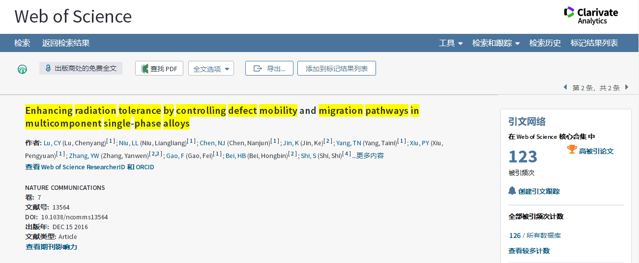 课题组卢晨阳教授发表的Nature communications文章“Enhancing radiation tolerance by controlling defect mobility and migration pathways in multicomponent single phase alloys”, 入选高被引论文。祝愿课题组师生再接再厉,继续前行。