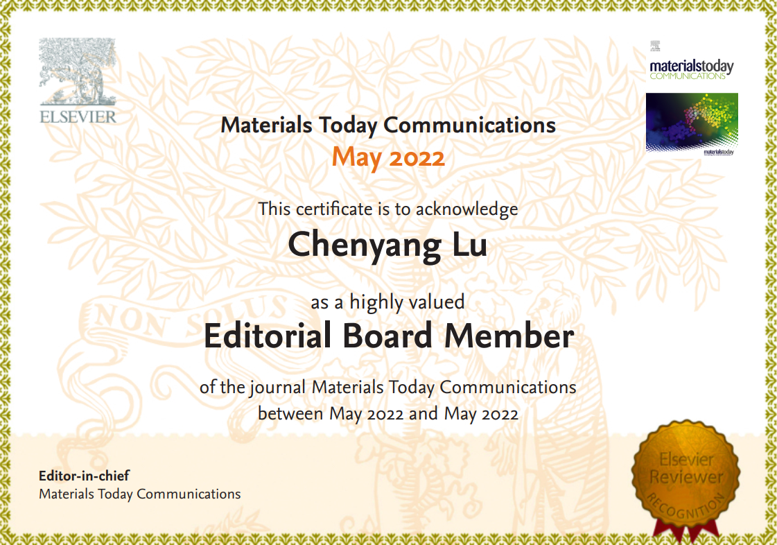 卢晨阳教授担任SCI期刊Materials Today Communications编委会成员。