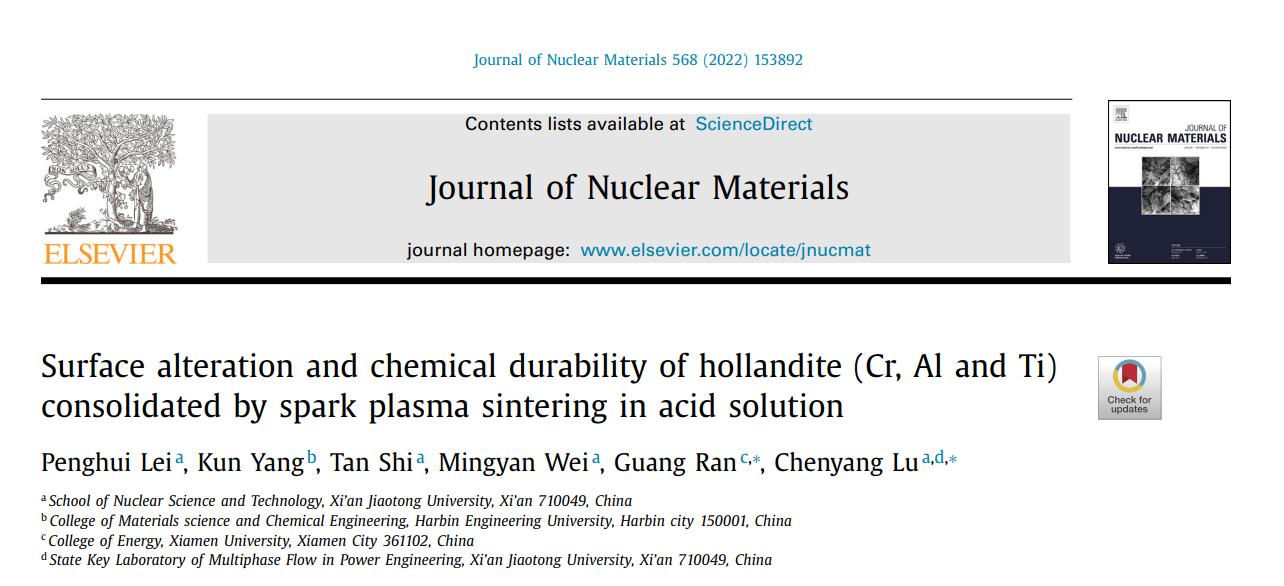 相关研究成果以题为“Surface alteration and chemical durability of hollandite (Cr, Al and Ti) consolidated by spark plasma sintering in acid solution”论文发表在“Journal of Nuclear Materials” 期刊上。