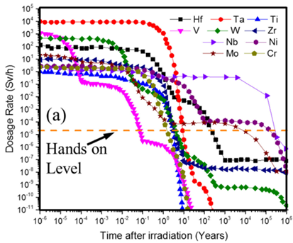 图2 聚变堆核心结构辐照水平下各元素冷却至可处理水平(Hands-on Level)所需时间,反映元素作为核结构材料中子活化情况