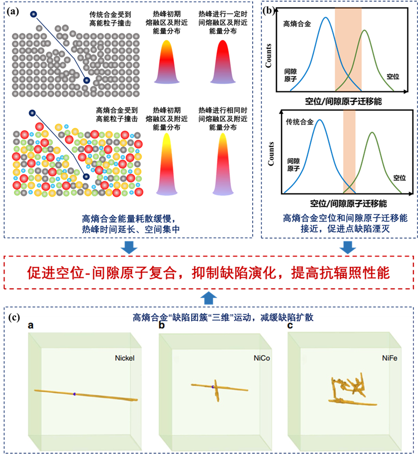 图3 高熵合金抗辐照机理:(a) 热峰延长促进点缺陷复合;(b) 空位型缺陷和间隙型缺陷迁移能接近,增加复合概率;(c) “三维”运动促进点缺陷复合,抑制缺陷团簇发展