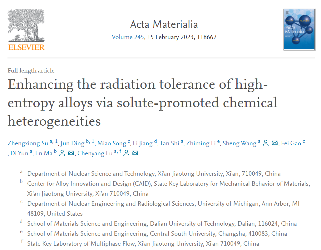 相关研究成果以题为“Enhancing the radiation tolerance of high-entropy alloys via solute-promoted chemical heterogeneities”论文发表在《Acta Materialia》期刊上。