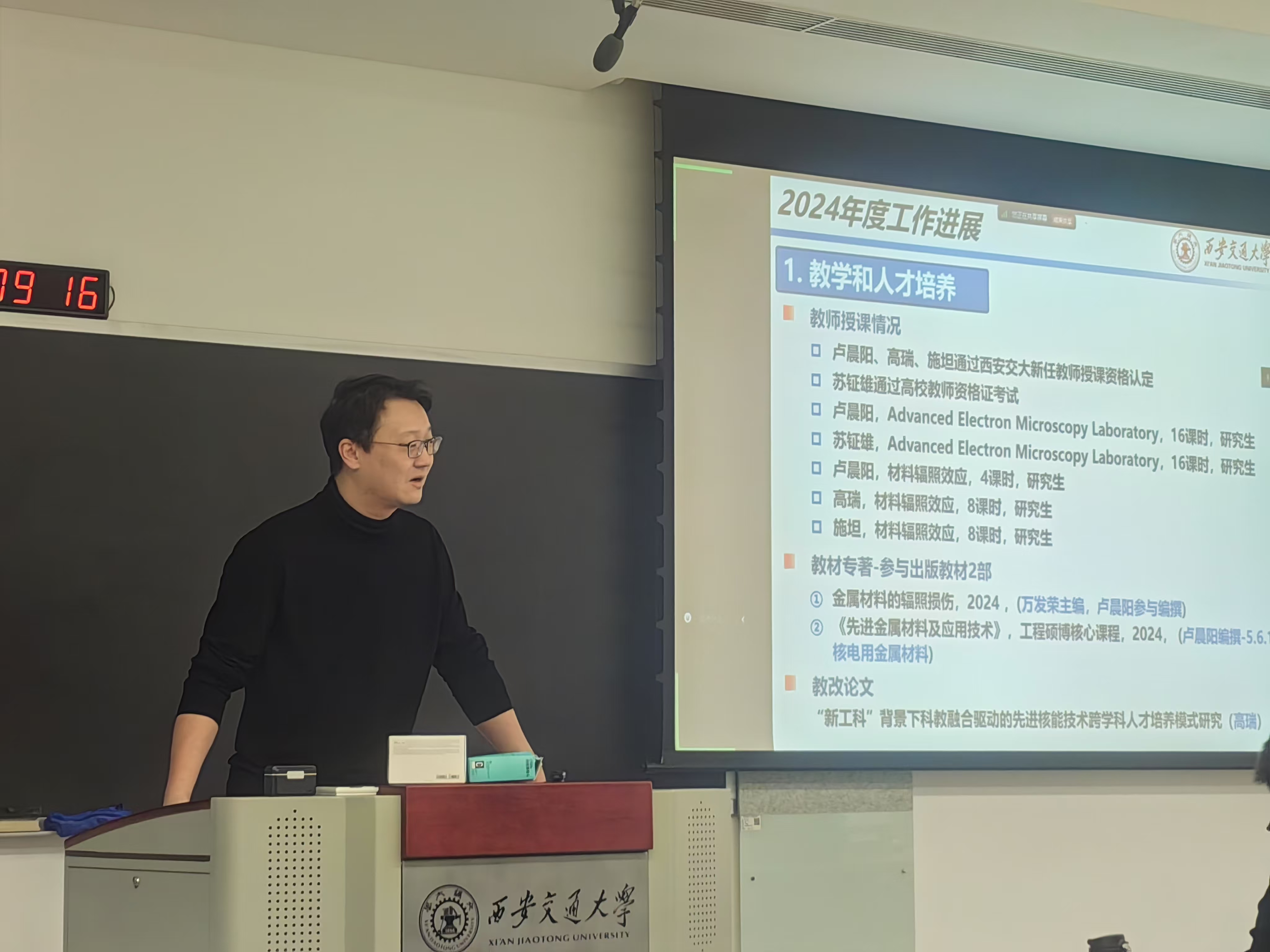 卢晨阳教授首先从教学和人才培养情况、科研情况、师资队伍建设情况、学术任职情况、平台及实验室建设情况、合作与交流情况、课题组团建活动七个方面总结了团队2024年度的主要工作成果与经验。随后,卢晨阳教授分享了课题组2025年度的工作重点,对团队各位老师和同学提出了下一阶段的期望。