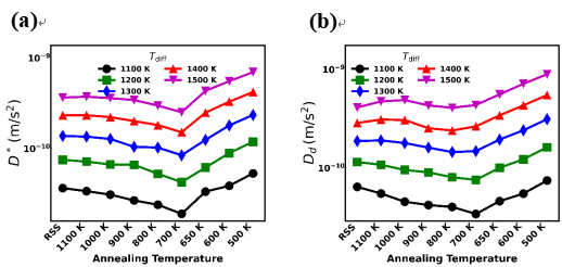 图1. (a)示踪扩散系数和(b)缺陷扩散系数随退火温度的非单调变化,突出显示在700 K时扩散系数达到最小值。