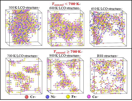 通过识别局部化学序(LCO)形成的独特扩散路径,本研究进一步揭示了渗流效应在扩散行为中的关键作用。在较低退火温度(T < 700 K)处理的结构中,富Fe和Co团簇通过空间互连形成连续的低能通道(图3),促进空位长程扩散;而当退火温度升高时,这些区域逐渐孤立化,增加了捕获空位和抑制扩散的可能性。这种行为突出了渗流效应在扩散动力学中的作用,展示了 LCO 如何在合金组成保持不变的情况下局部调制扩散网络。