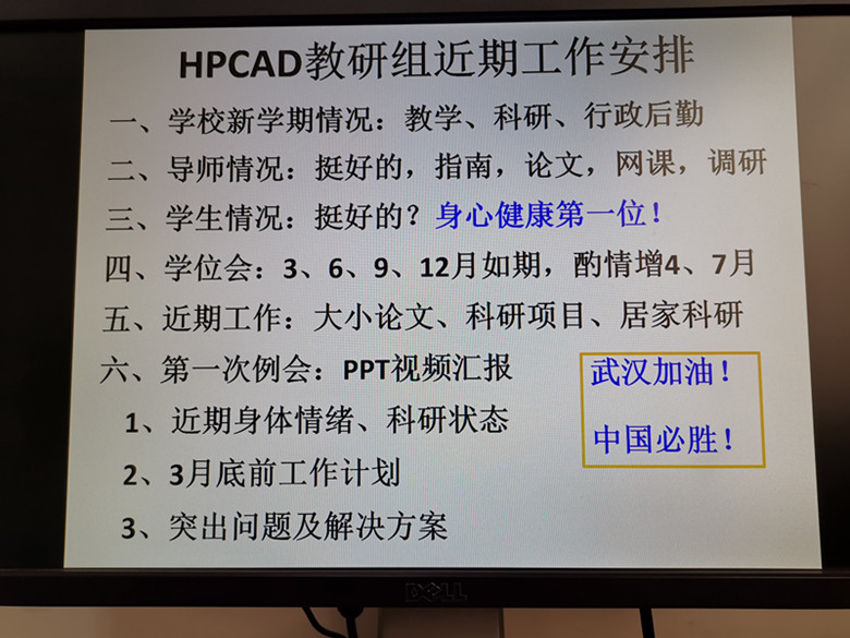 内容: 为重新激活科研气氛、熟练掌握网络会议工具,教研组成功举办了第一次视频例会。 除一名博士生请假、两名博士生留学瑞士以外,教研组师生共25人克服各种困难参加了本次视频例会。 每名师生通过腾讯会议室,口头或者PPT汇报了近期身体情绪科研状态、3月底前工作计划、目前碰到的突出问题及解决方案。本次视频例会持续了约3个小时。 发现,教研组全体师生总体状态良好,无感染情况。 目前碰到的突出问题:疫情来势突然,回家前未带足科研资料数据。 解决方案:强调教研组是个能战斗的群体,每个人不是孤军奋战;发挥团队优势、调动个人主观能动性解决各种问题,如琚亚平老师已重启353、426办公室电脑网络,绝大多数学生已具备远程科研条件,极少部分学生居家电脑条件还有待落实。 衷心祝愿教研组全体师生在居家科研期间,身体健康、情绪愉快、作息规律,克服重重困难,在特殊时期取得特殊进展! 武汉加油,中国必胜! 图1 视频例会现场剪影 图2 视频例会PPT剪影