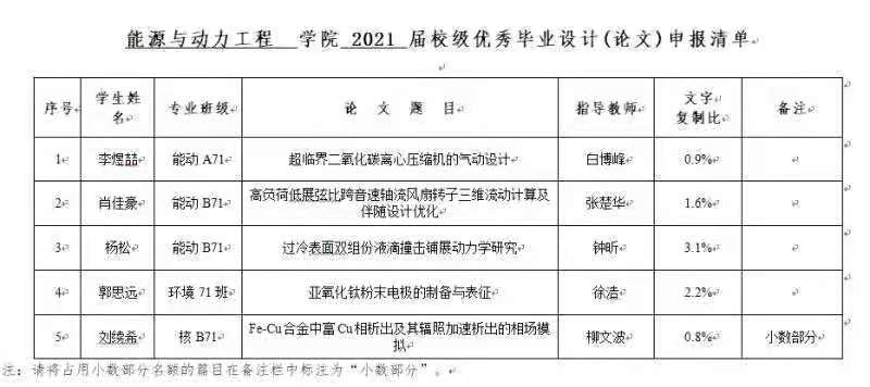 内容: 肖佳豪以优异成绩获得保研及流体机械及工程专业第一个直博生资格,并获得西安交通大学2021届Top1%优秀毕业设计论文、首届(2021年)全国能源动力类专业百篇优秀毕业设计论文(第8名),祝愿肖佳豪同学未来4.5年内在多级高速轴流压气机非定常流动理论及设计优化方向上取得更大创新性研究成果! 至此,HPCAD教研组共获得校级优秀毕设论文5篇http://epe.xjtu.edu.cn/info/1061/4674.htm,全国百篇优秀毕业设计论文1篇http://epe.xjtu.edu.cn/info/1112/14520.htm 团队将不忘育人初心、牢记一流使命,力争在人才培养、科学研究方面取得更大成果!