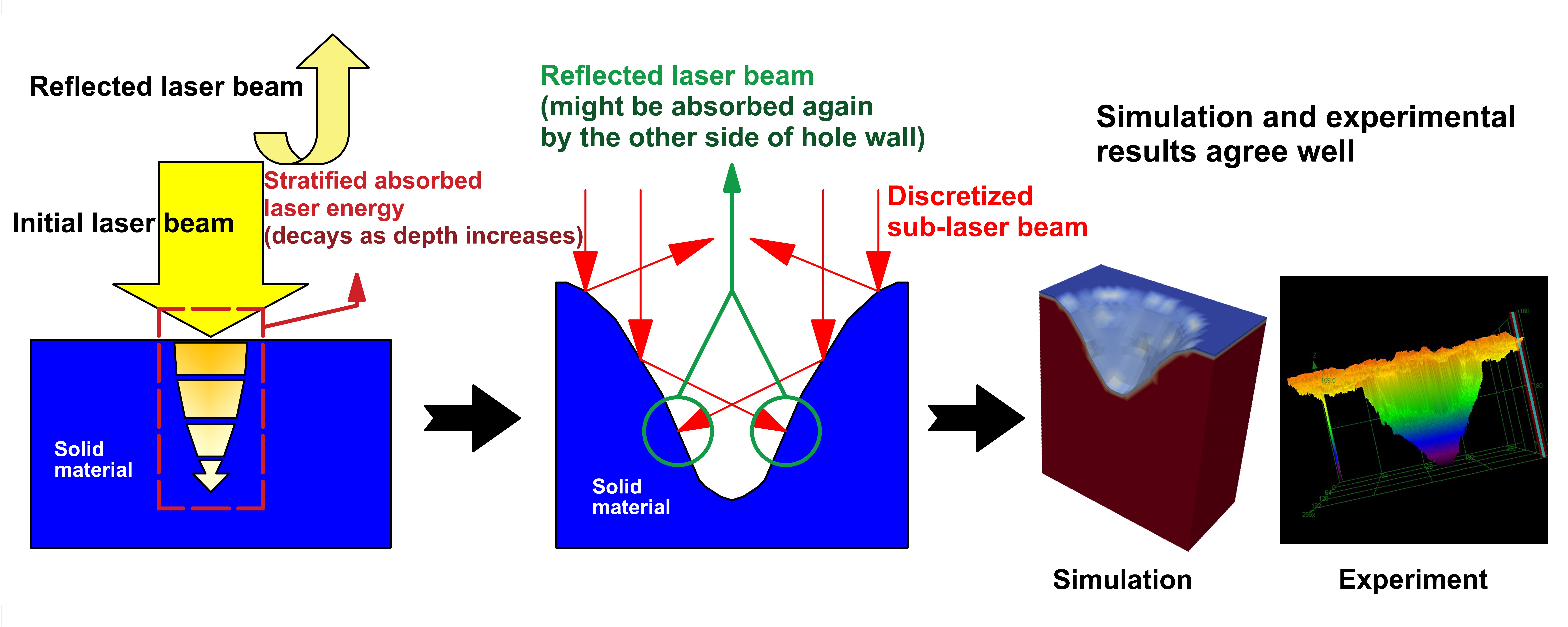在国家重点研发计划“增材制造与激光制造”重点专项资助下,基于OpenFOAM开源平台成功开发出一套功能较为全面的激光微纳加工数值计算模型。该模型能够同时体现出激光加工过程中存在的物理相变、化学反应、库伦爆炸、激光多次反射-吸收、等离子体散焦与屏蔽效应以及多场(热场、表面流场、物理相场及化学组分场)耦合作用,可实现对微米-亚微米级的打孔、扫描、周期结构加工等工艺过程的数值模拟以及对加工质量、性能指标的测算和预估,为超快激光加工技术的更广泛应用奠定提供强有力的理论指导,在Optics and Laser Technology、Optics Communications和机械工程学报等国内外重要期刊发表论文4篇。