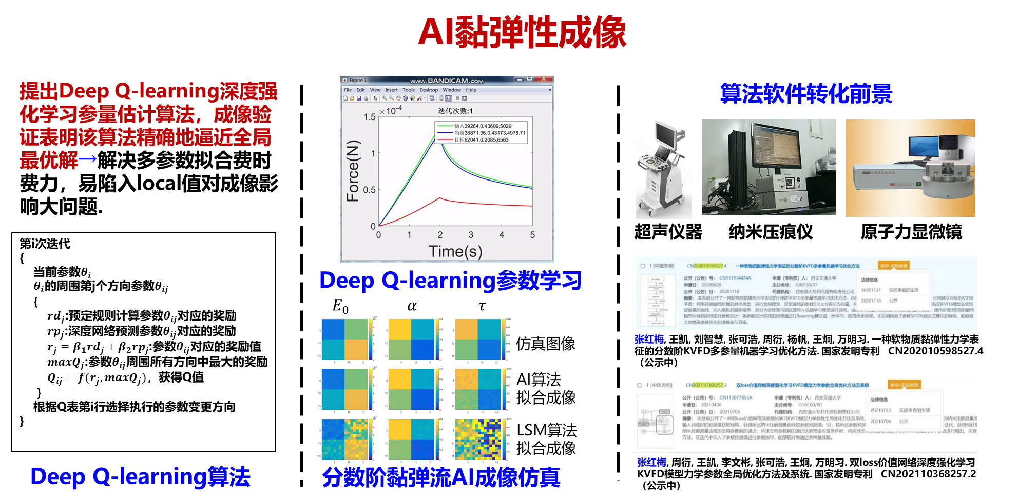 - 张红梅,王凯,刘智慧,张可浩,周衍,杨帆,王炯,万明习. 一种软物质黏弹性力学表征的分数阶KVFD多参量机器学习优化方法. 国家发明专利, CN 111914474 B