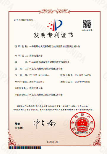 - 一种利用电火花膨胀驱动的线性压缩机及其控制方法,ZL 2025 1 0133285.4,授权日期:2025年09月19日