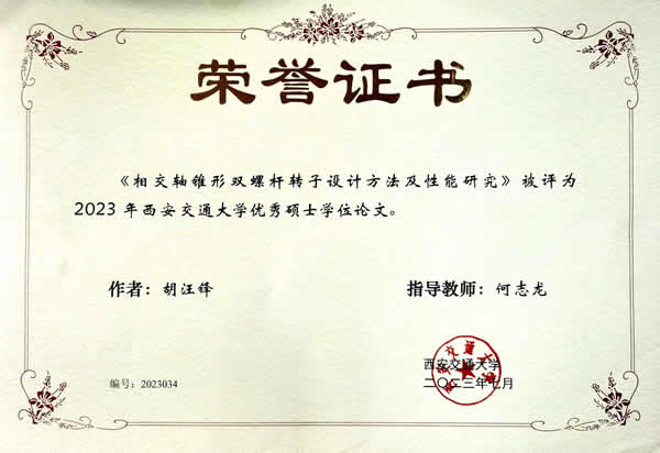 胡汪锋同学的毕业论文《相交轴锥形双螺杆转子设计方法及性能研究》,被评为2023 年西安交通大学优秀硕士学位论文。