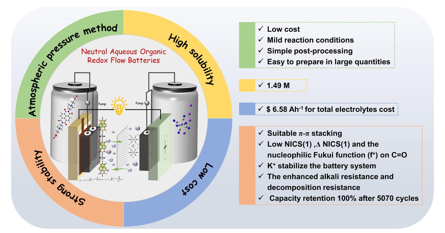 随着可再生能源的快速发展,开发低成本、长寿命、高安全的大规模储能技术成为实现碳中和的关键。中性水系有机液流电池(AORFBs)因分子结构可调、环境友好等优势备受关注。萘酰亚胺(NDI)衍生物凭借其高度的π-π共轭体系和双电子存储特性成为理想候选材料,然而循环过程中的侧链和酰亚胺环易受OH⁻亲核攻击导致分解,且自由基态分子聚集引发粘度激增,严重制约其实际应用。现有NDI材料虽通过亲水基团调控提升了溶解度,但仍面临分子稳定性不足和电池循环寿命短等挑战。因此,开发兼具高稳定性、低成本的NDI电解质材料是推动AORFBs商业化的核心课题。